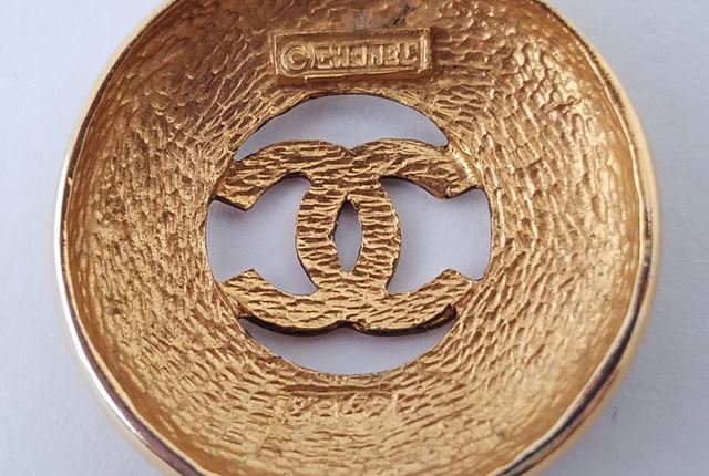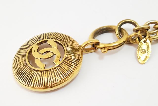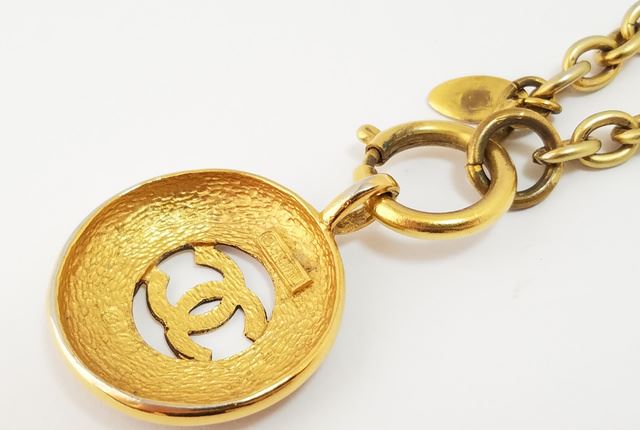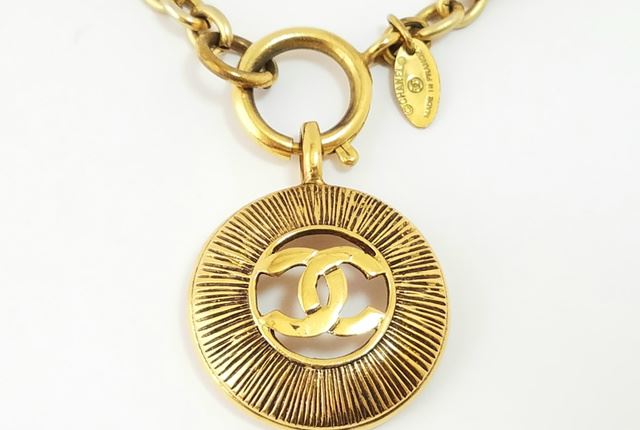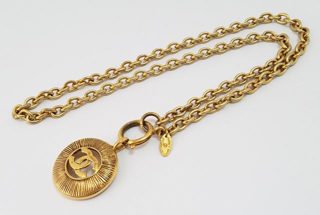 One Chanel Gold-tone Metal CC Logo Cutout Sunburst Pendant Necklace. Item is sold AS-IS. All available information is listed in the description and shown in the photo. Chanel Classic necklace features gold-tone chain, a circular sunburst pendant housing a cutout interlocking CC logo and an oversize O-ring clasp closure.