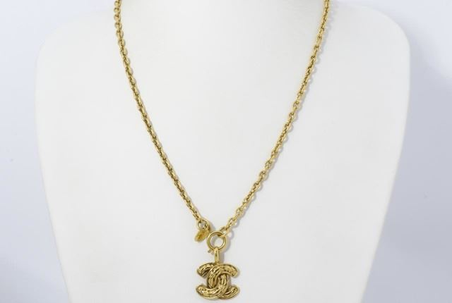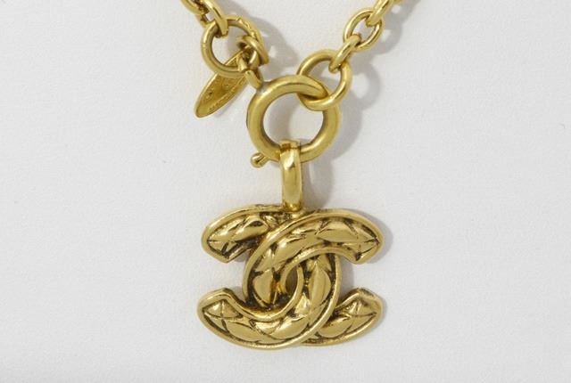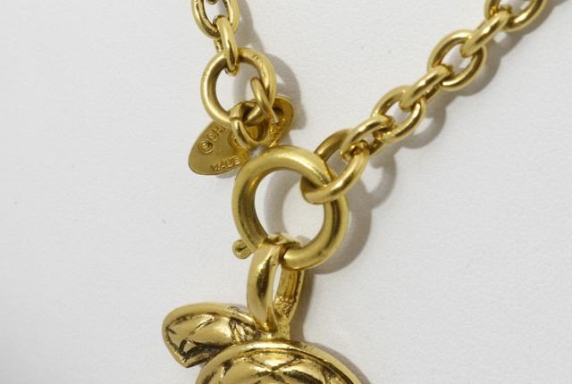 One Chanel Gold-tone Metal CC Quilted Logo Pendant Necklace. Item is sold AS-IS. All available information is listed in the description and shown in the photo. A superb and classic vintage Chanel gold-tone necklace which has a coveted large CC quilted pendant and a fashionably shorter oval-link chain. Completer with a spring-ring closure.