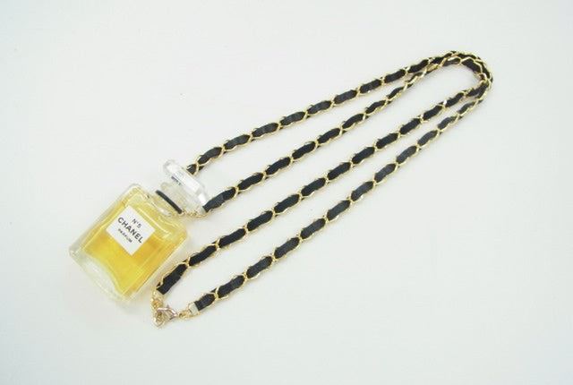 One Chanel Gold-tone No.5 Perfume Bottle Charm Necklace. Item is sold AS-IS. All available information is listed in the description and shown in the photo. Chanel Necklace features gold-tone chain entwined with black leather, a small Chanel No.5 perfume bottle pendant and lobster clasp closure.