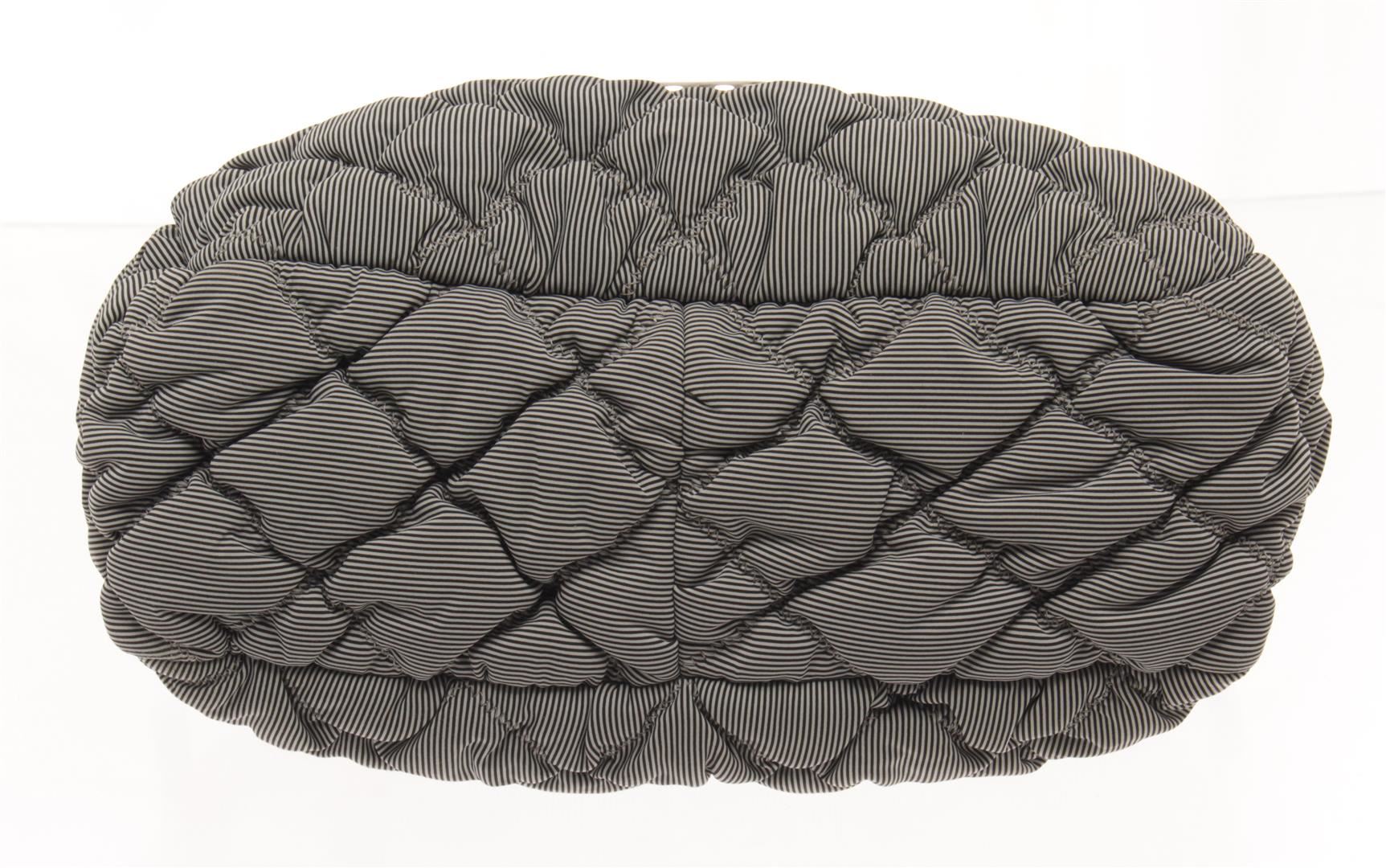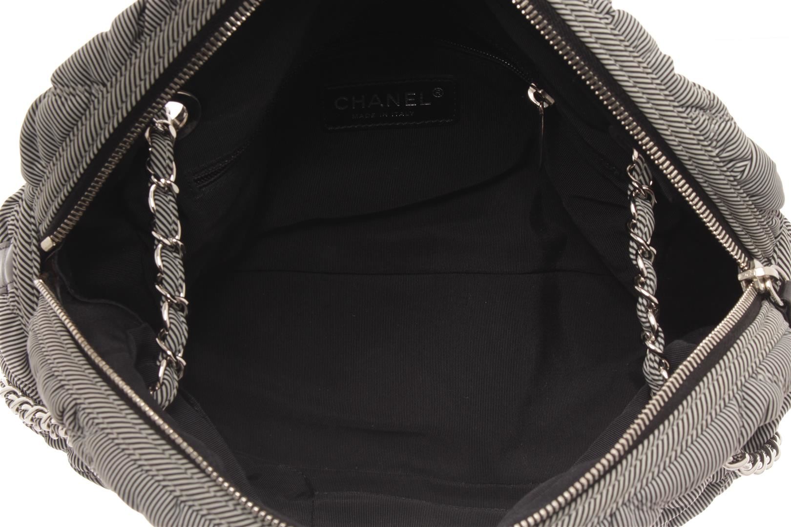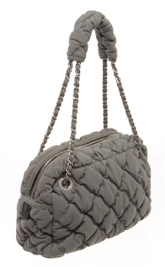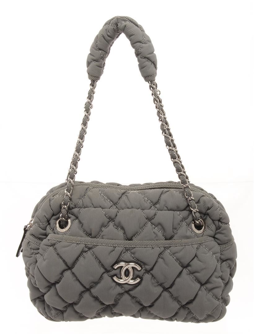 One Chanel Gray Fabric X Nylon Bubble Shoulder Bag. Item is sold AS-IS. All available information is listed in the description and shown in the photo. Chanel Gray Fabric X Nylon Bubble Shoulder Bag with nylon bubble body, silver-tone chain shoulder straps, a top zip closure, and an interior zip and slip pockets 11.81"L x 8.27"W x 5.51"H / 29.99 x 21.00 x 13.99 cm
