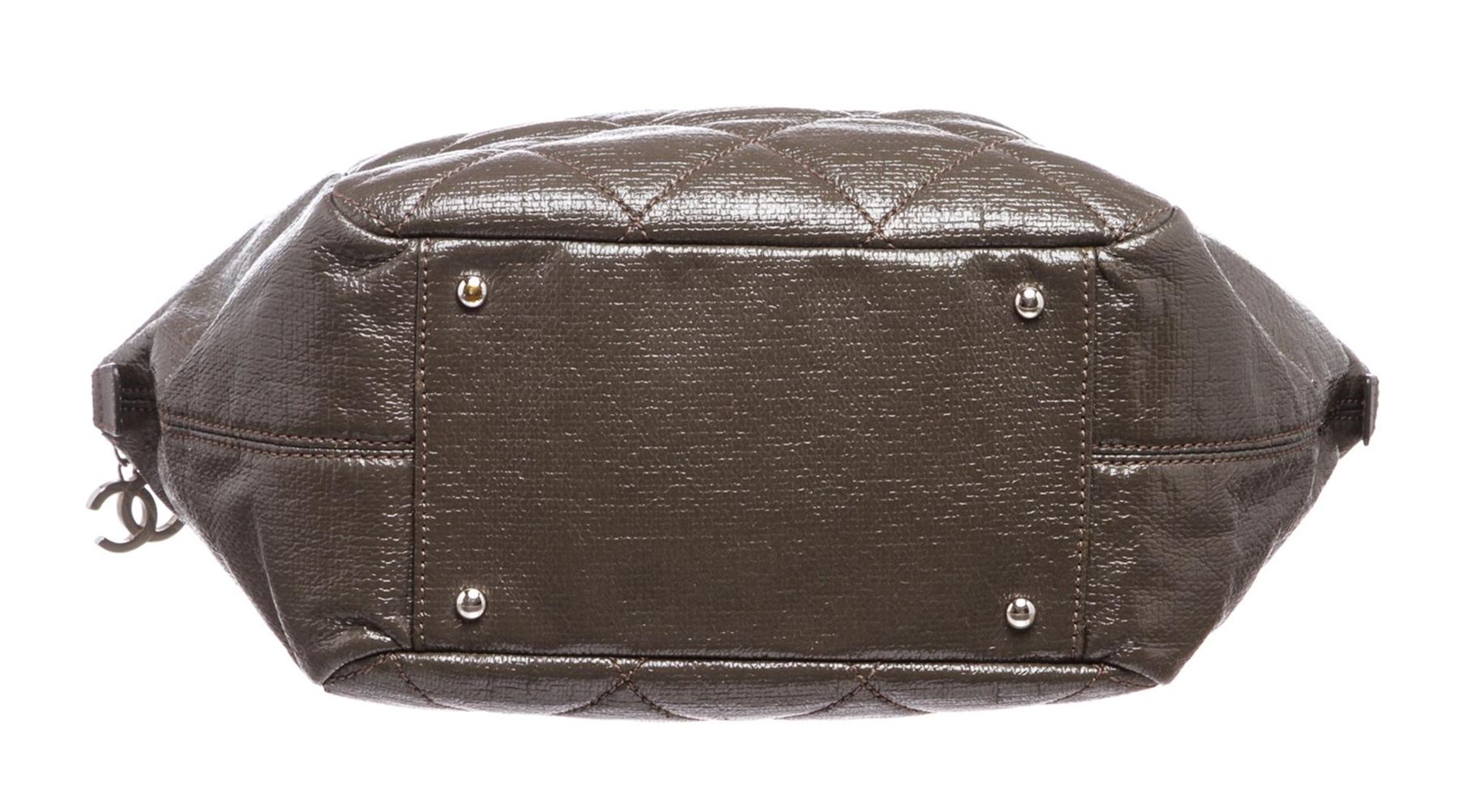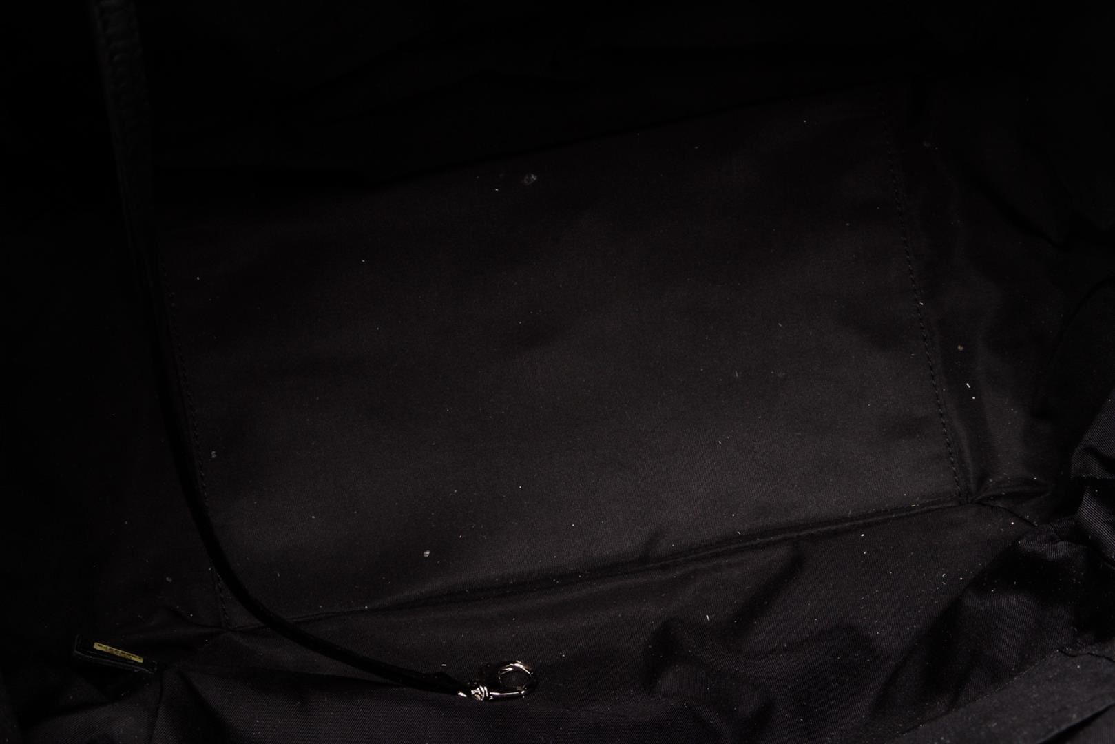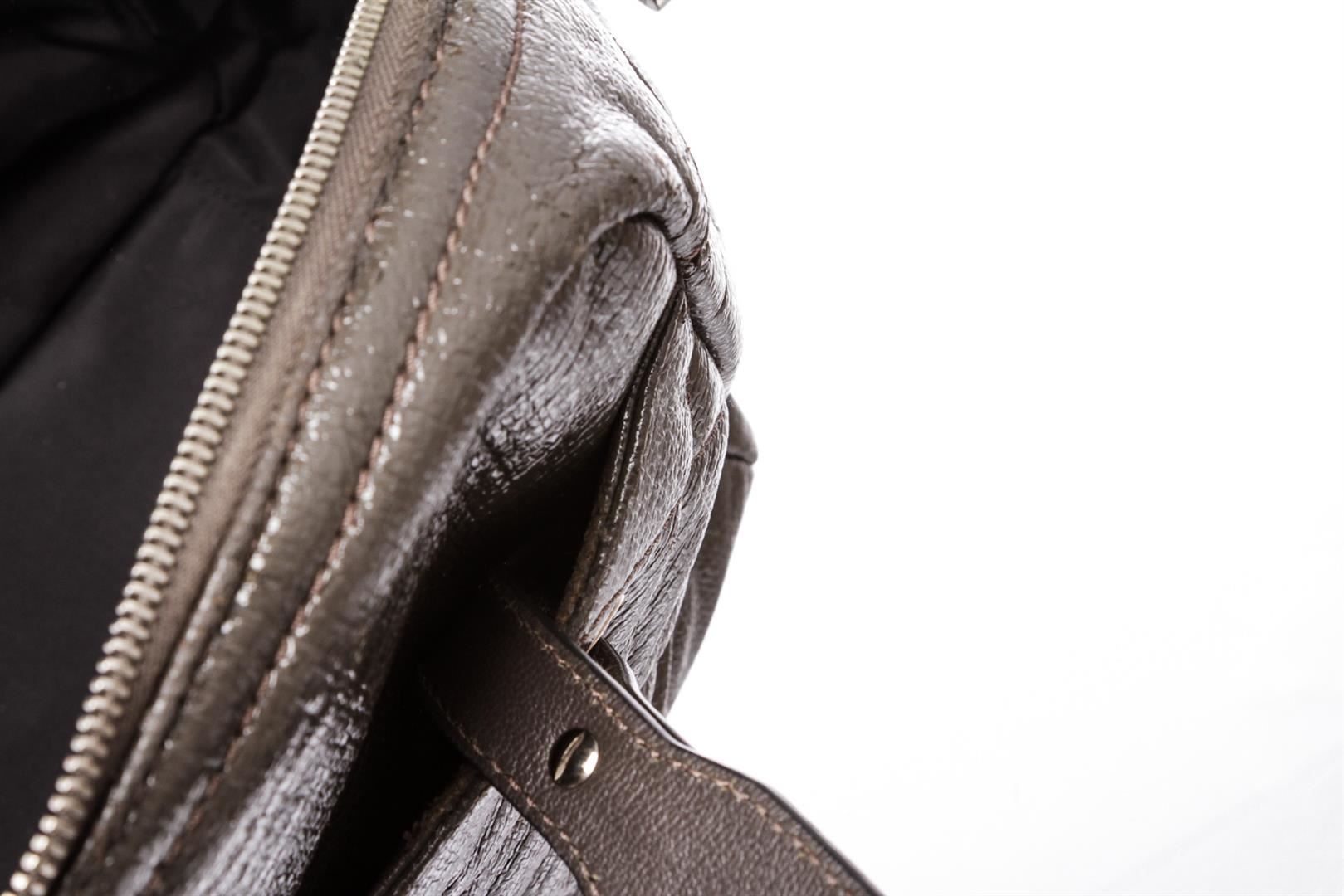 Crafted out of gray vinyl, double flat handles, silver tone hardware, and zip top closure. Outer side slip pocket. Inner black fabric lining, side zip pocket, and dual slip pockets. Please note: material pealing on corners.