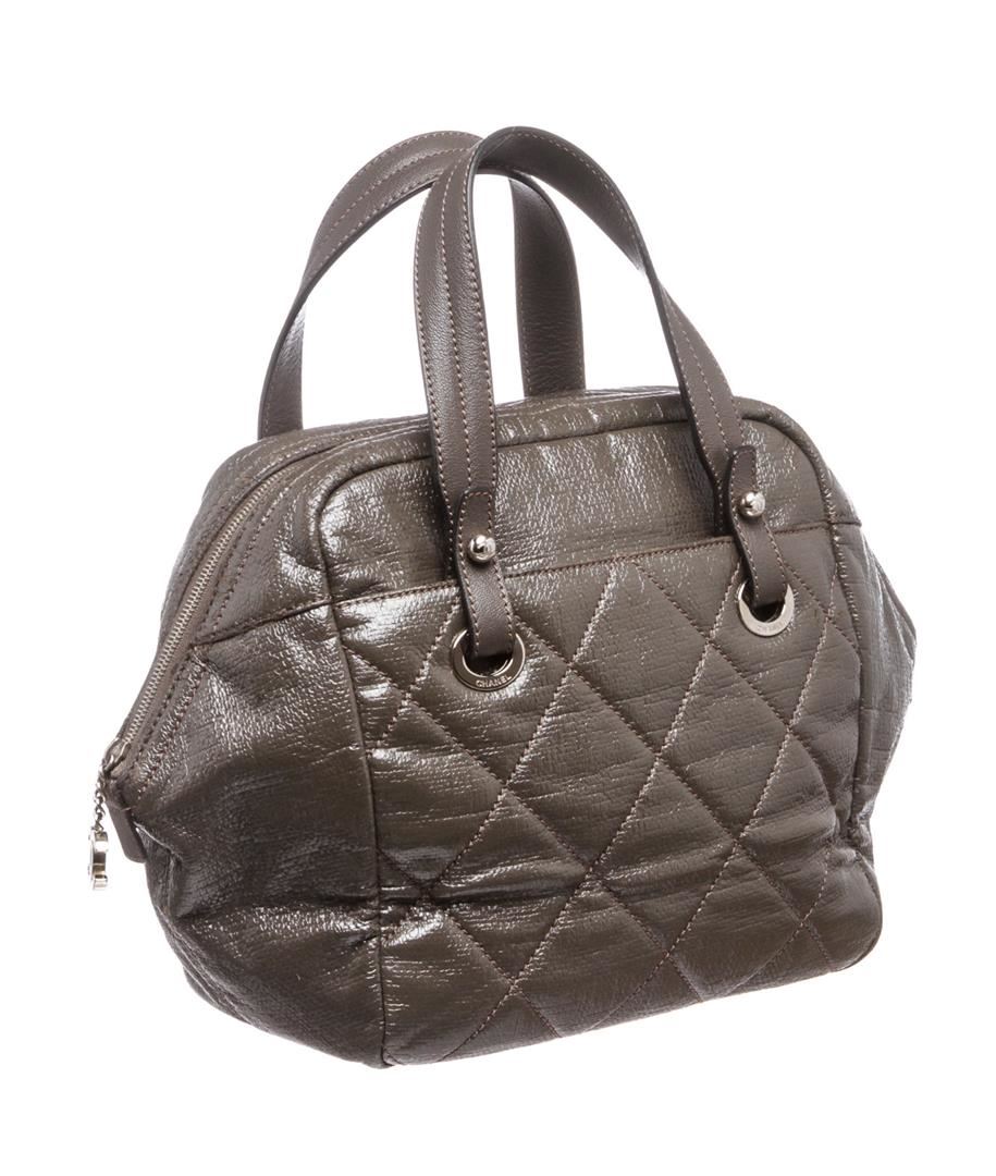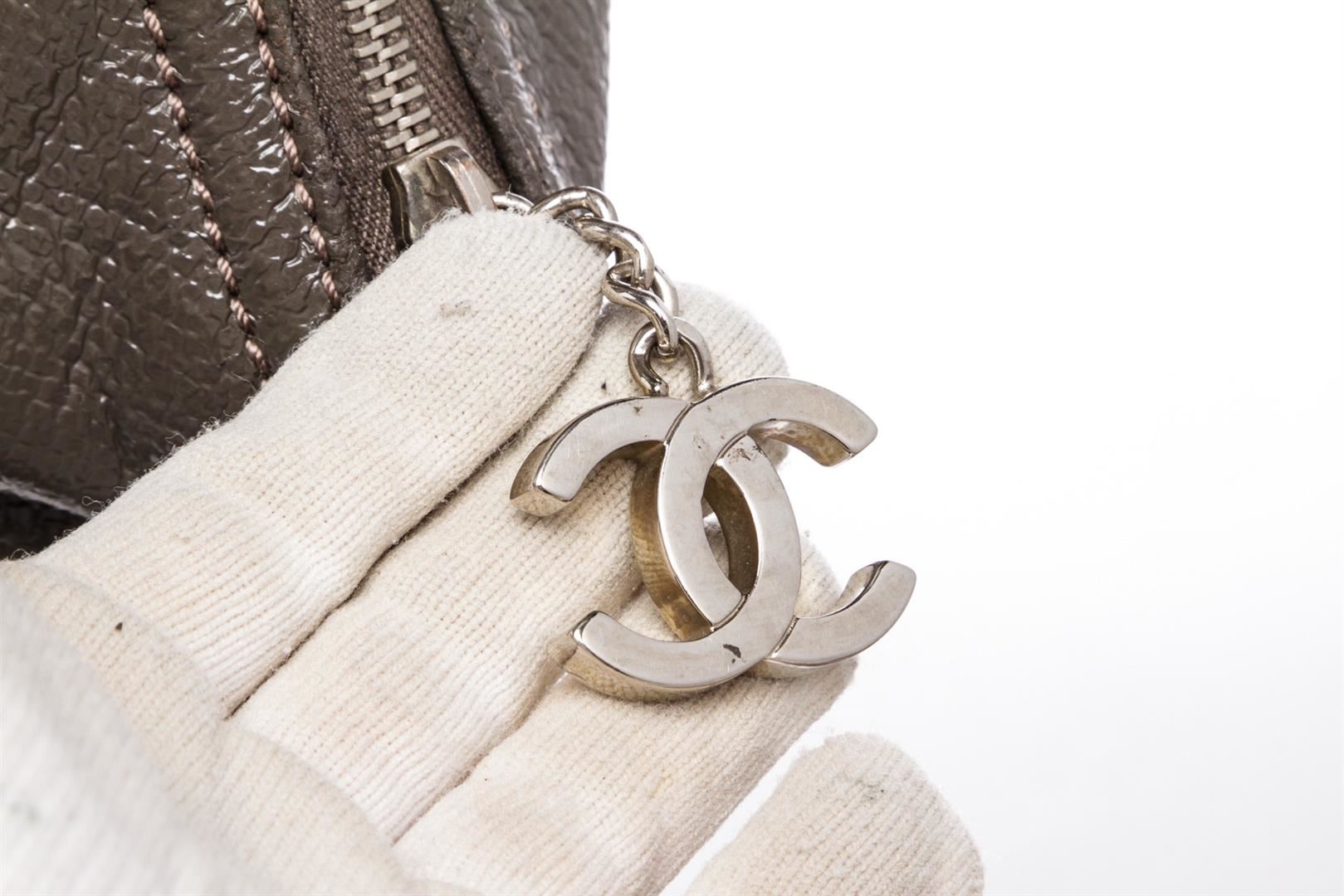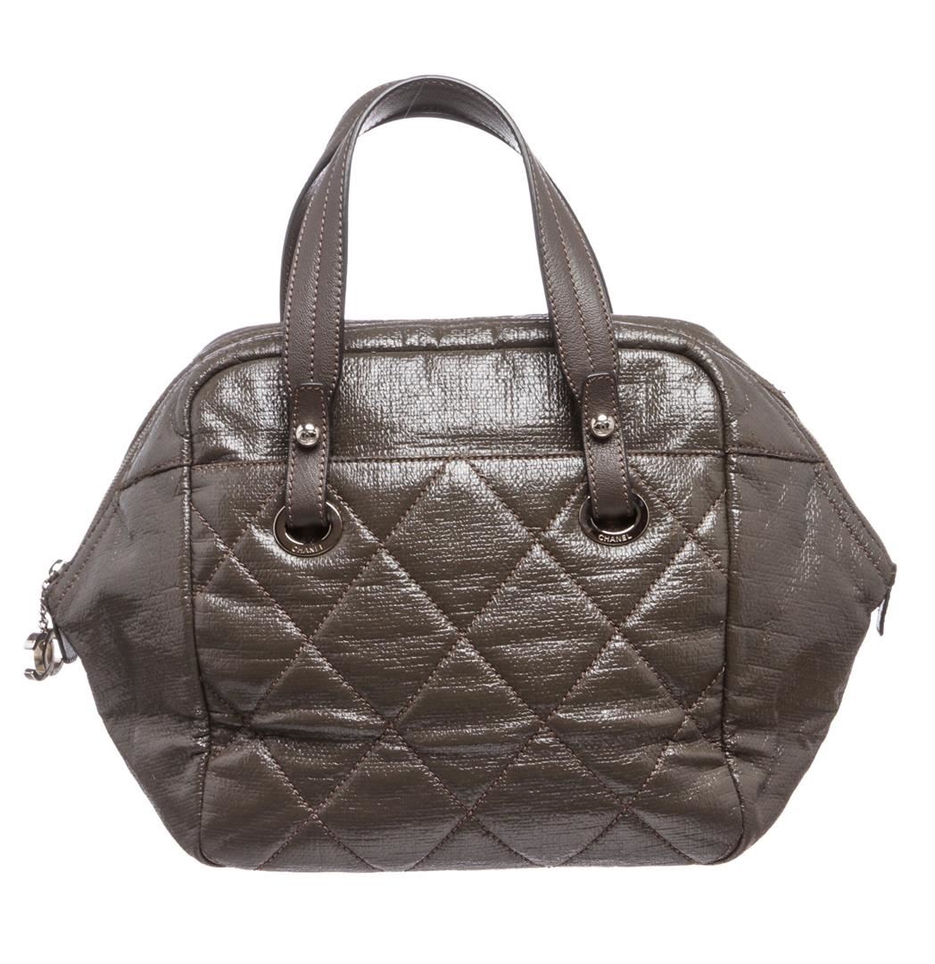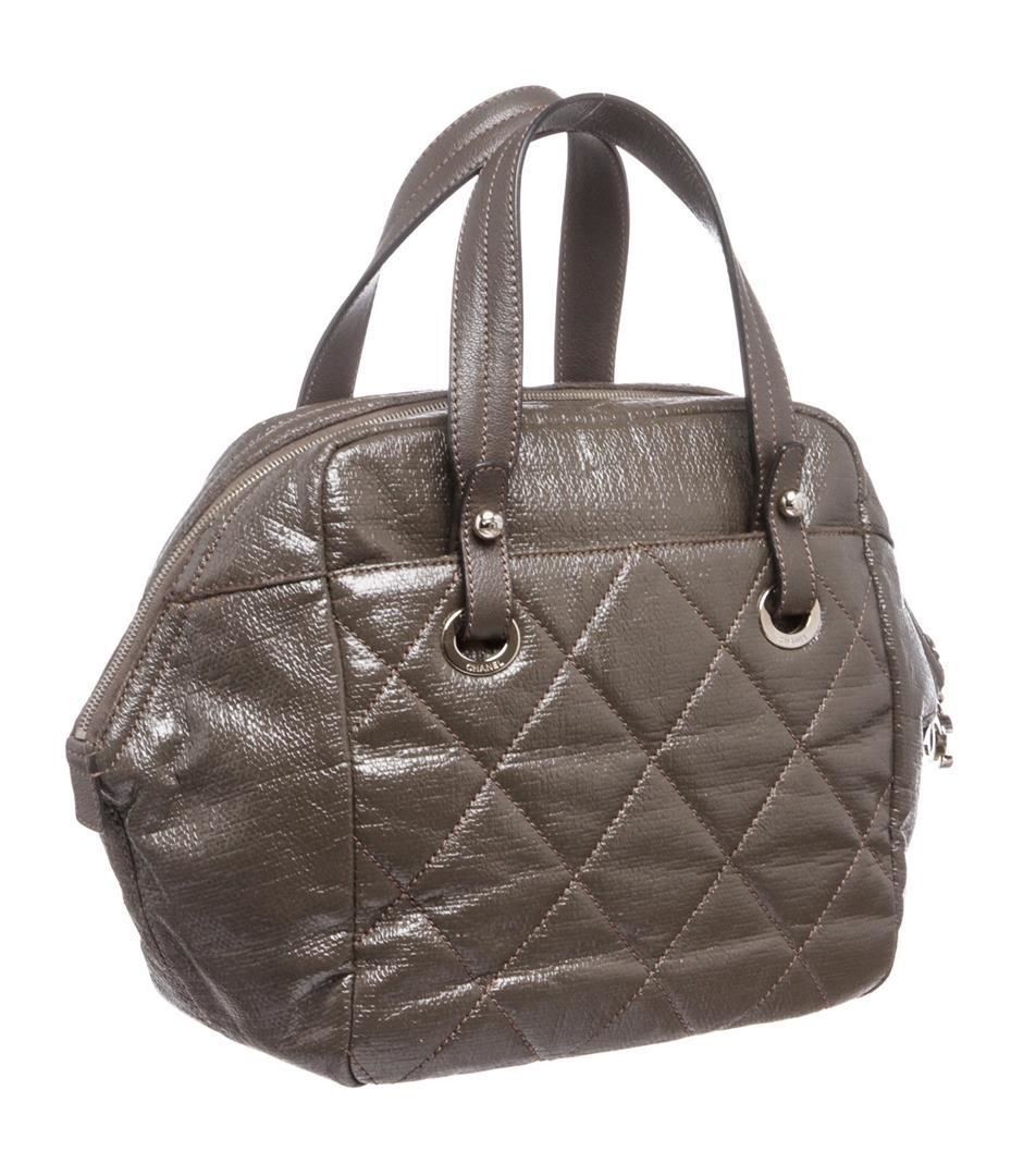 Crafted out of gray vinyl, double flat handles, silver tone hardware, and zip top closure. Outer side slip pocket. Inner black fabric lining, side zip pocket, and dual slip pockets. Please note: material pealing on corners.