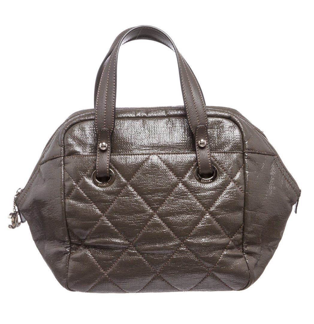 Chanel Gray Quilted Vinyl Bowling Satchel Handbag. All available information is listed in the description and shown in the photos. Crafted out of gray vinyl, double flat handles, silver tone hardware, and zip top closure. Outer side slip pocket. Inner black fabric lining, side zip pocket, and dual slip pockets. Please note: material pealing on corners. Creasing. 23171 Measurements: Length: 10.5 in / 27 cm Width: 3 in / 8 cm 11.25 in / 29 cm Condition: Pre-Owned Good overall, please see photographs for detail.