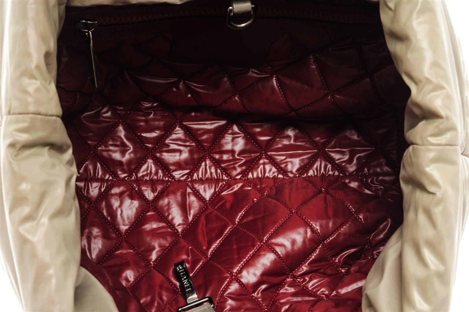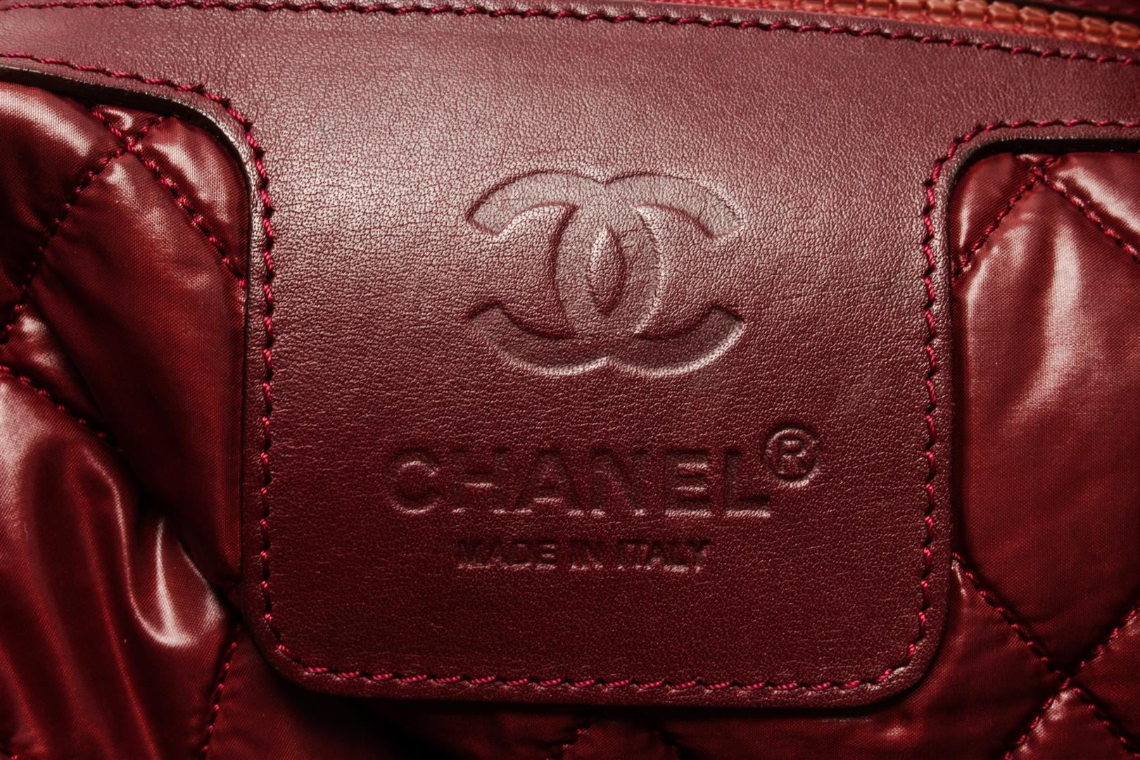 One Chanel Khaki Nylon Coco Cocoon Tote Bag. Item is sold AS-IS. All available information is listed in the description and shown in the photo. Chanel khaki nylon Coco Cocoon tote bag with hook closure, silver-tone hardware, red nylon lining, one interior zip pocket, khaki leather on the base of the straps and red leather around the interior pocket zipper, and top handles. Height: 9.5" Width: 17" Depth: 5" , Handle Drop: 6" / 24.13 x 43.18 x 12.7 Cm