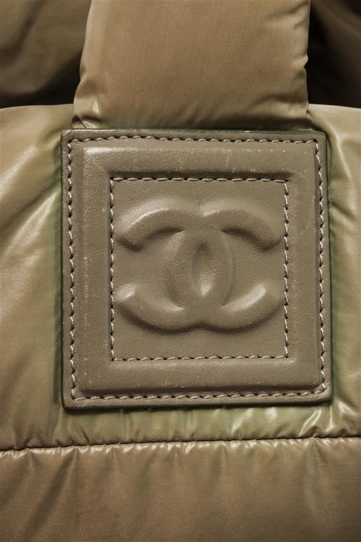 One Chanel Khaki Nylon Coco Cocoon Tote Bag. Item is sold AS-IS. All available information is listed in the description and shown in the photo. Chanel khaki nylon Coco Cocoon tote bag with hook closure, silver-tone hardware, red nylon lining, one interior zip pocket, khaki leather on the base of the straps and red leather around the interior pocket zipper, and top handles. Height: 9.5" Width: 17" Depth: 5", Handle Drop: 6" / 24.13 x 43.18 x 12.7 Cm