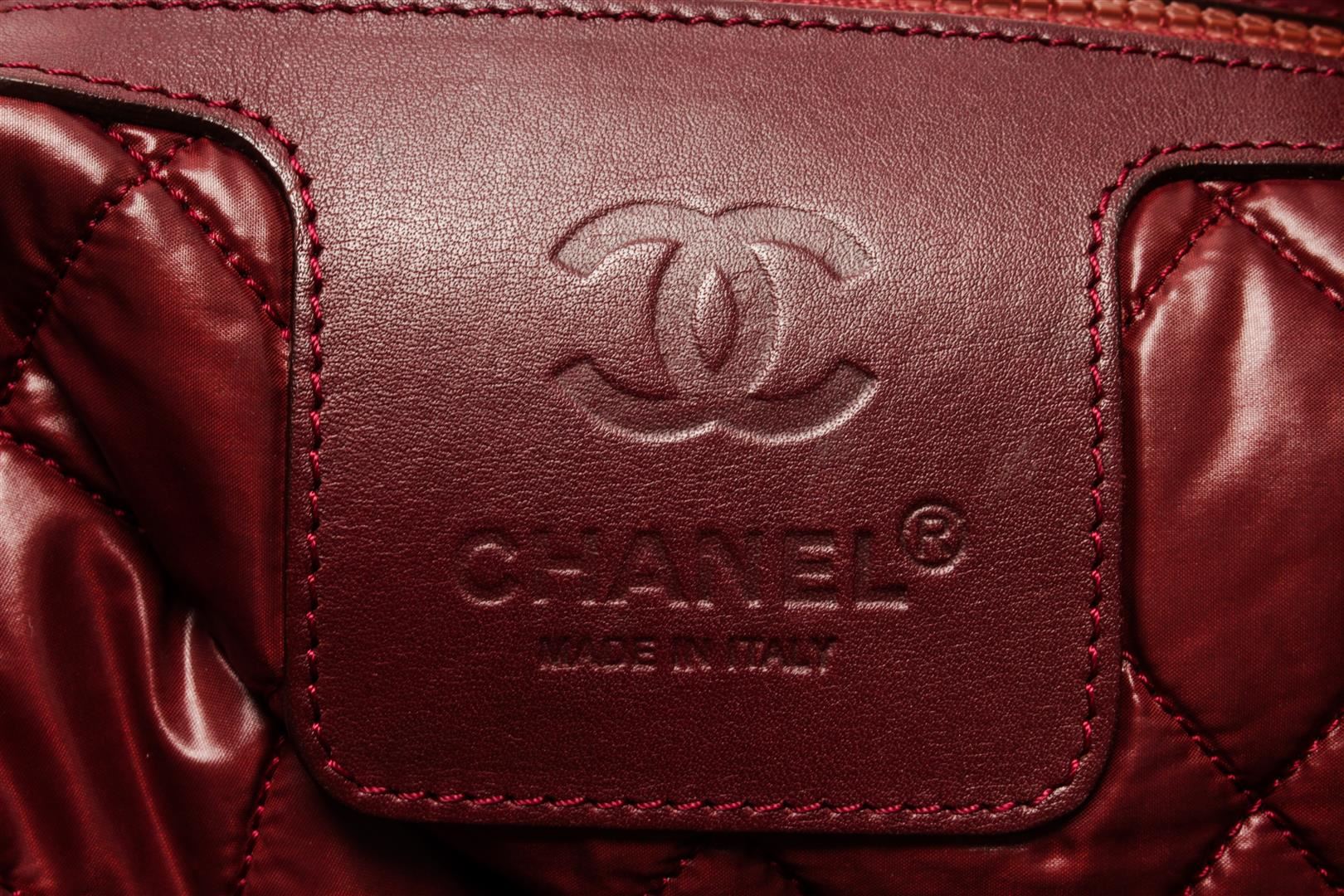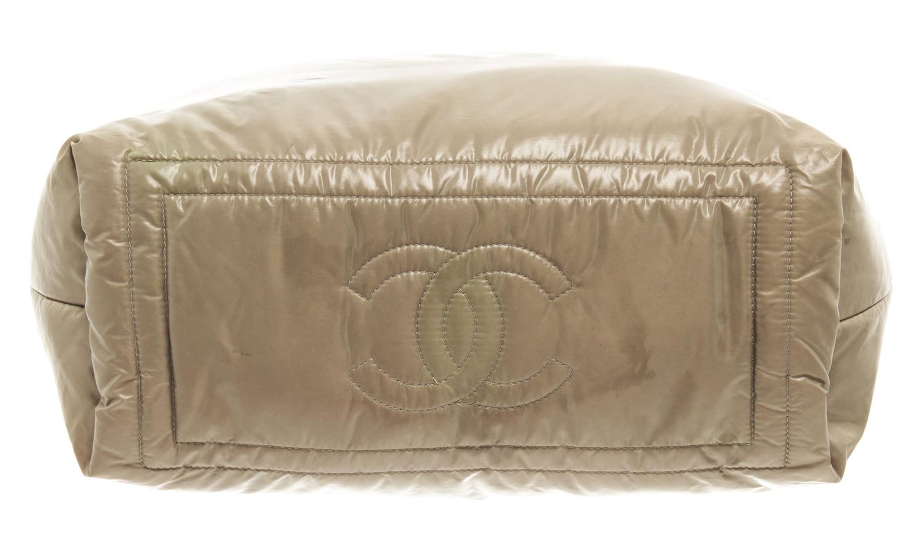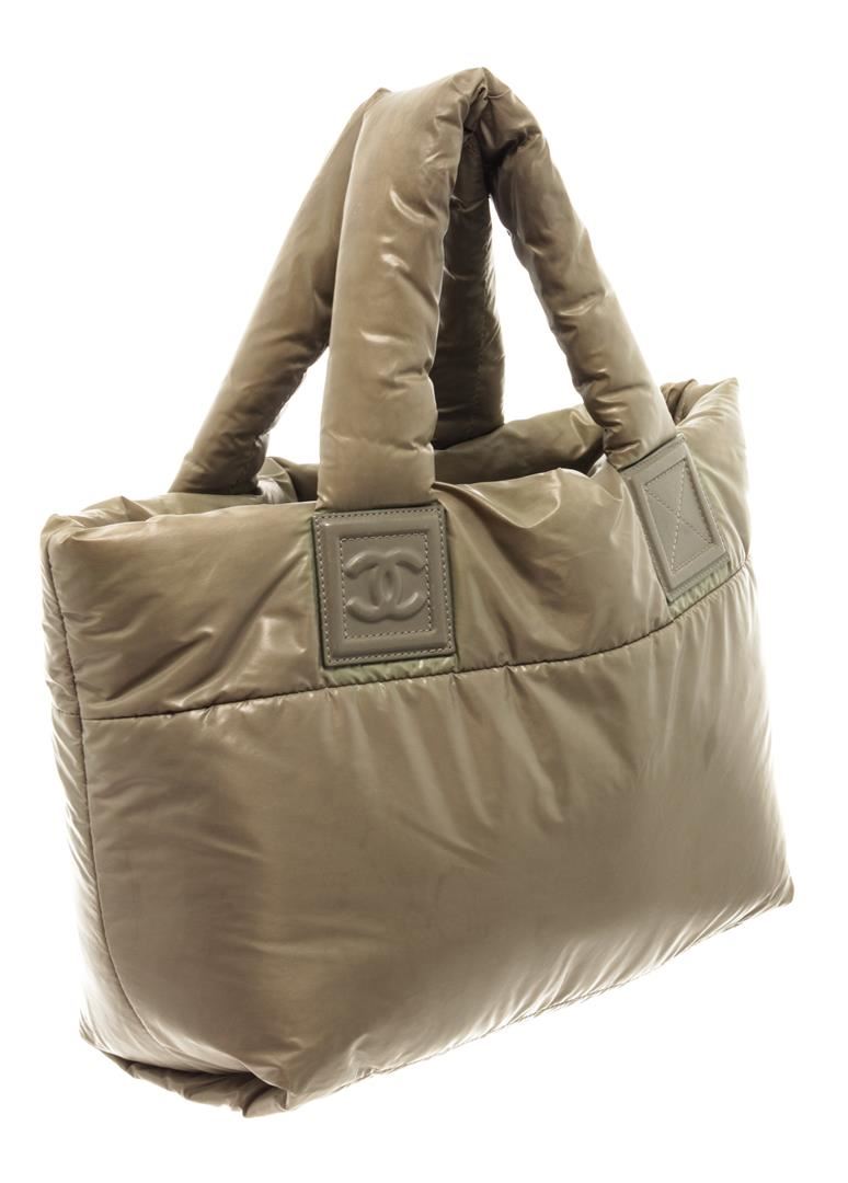 One Chanel Khaki Nylon Coco Cocoon Tote Bag. Item is sold AS-IS. All available information is listed in the description and shown in the photo. Chanel khaki nylon Coco Cocoon tote bag with hook closure, silver-tone hardware, red nylon lining, one interior zip pocket, khaki leather on the base of the straps and red leather around the interior pocket zipper, and top handles. Height: 9.5" Width: 17" Depth: 5", Handle Drop: 6" / 24.13 x 43.18 x 12.7 Cm