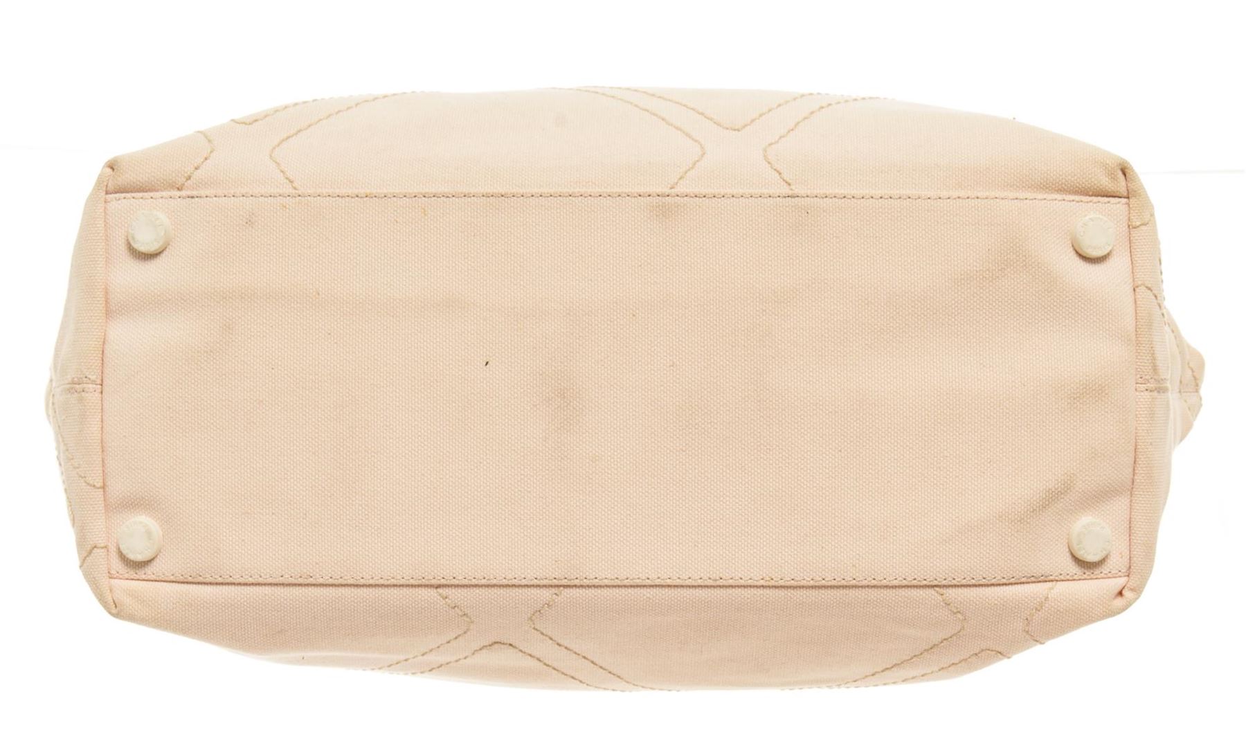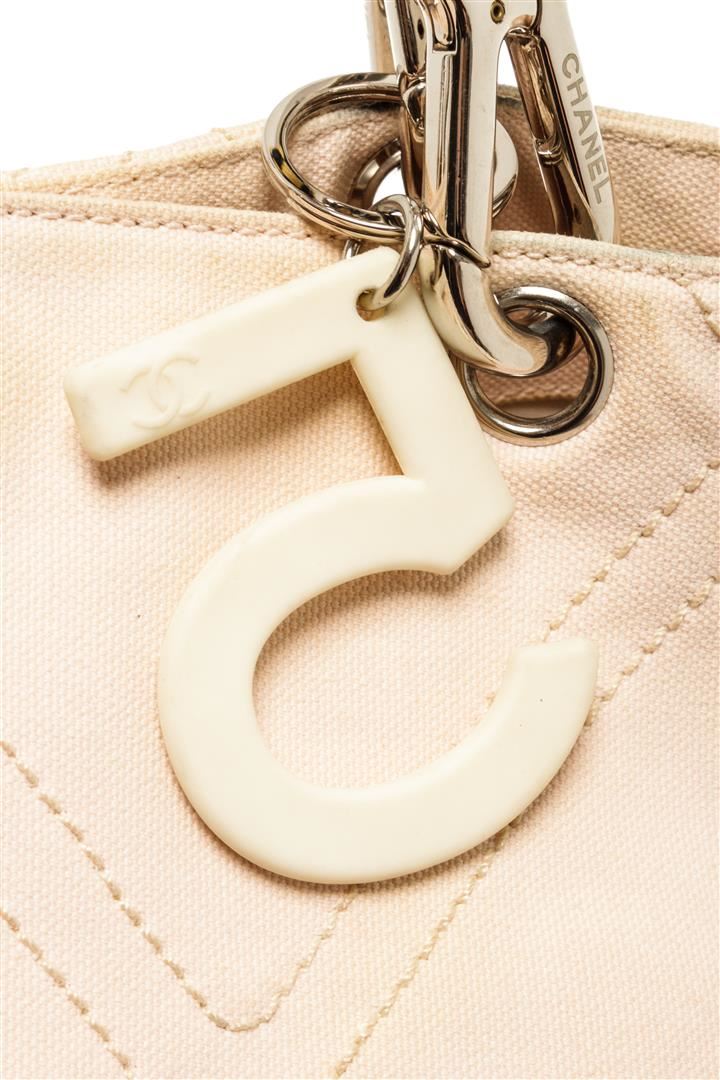 Chanel Light Pink Beige Leather No.5 Coco Mark Rope Tote Bag. All available information is listed in the description and shown in the photos. Chanel Light Pink Beige Canvas No.5 Coco Mark Rope Tote Bag with silver-tone hardware, Chanel no.5 iconic logo on the strap charm, front zipped pocket, Chanel scripted logo fabric lining, leather & rope shoulder strap, and an open closure at the top. .