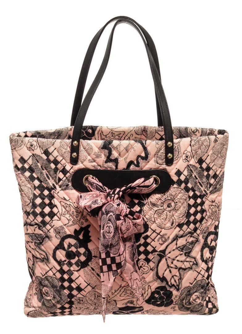 One Chanel Light Pink Printed Corduroy with Silk Scarf Tote Bag. Item is sold AS-IS. All available information is listed in the description and shown in the photo. Chanel Light Pink Printed Corduroy with Silk Scarf Tote Bag with gold-tone hardware, black leather trims, black canvas lining, dual leather flat top handles, and zip closure at the top. .
