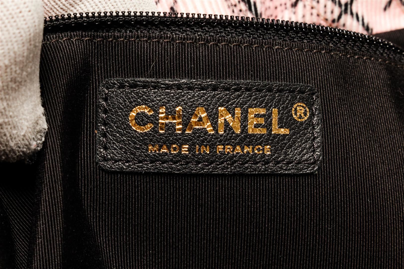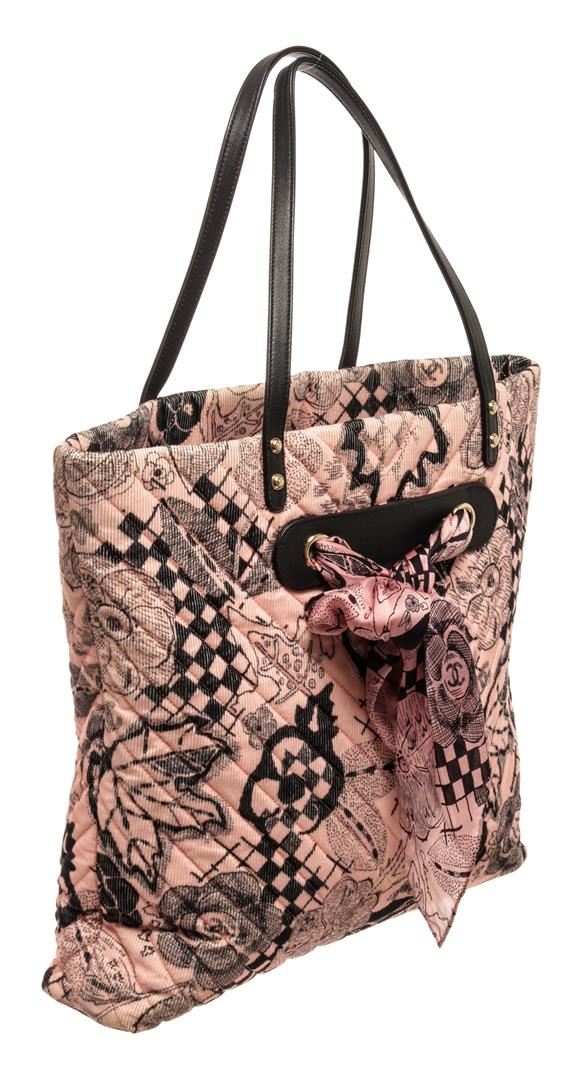 One Chanel Light Pink Printed Corduroy with Silk Scarf Tote Bag. Item is sold AS-IS. All available information is listed in the description and shown in the photo. Chanel Light Pink Printed Corduroy with Silk Scarf Tote Bag with gold-tone hardware, black leather trims, black canvas lining, dual leather flat top handles, and zip closure at the top. .