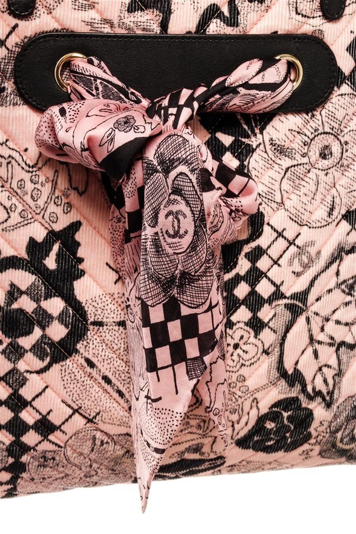 One Chanel Light Pink Printed Corduroy with Silk Scarf Tote Bag. Item is sold AS-IS. All available information is listed in the description and shown in the photo. Chanel Light Pink Printed Corduroy with Silk Scarf Tote Bag with gold-tone hardware, black leather trims, black canvas lining, dual leather flat top handles, and zip closure at the top. .