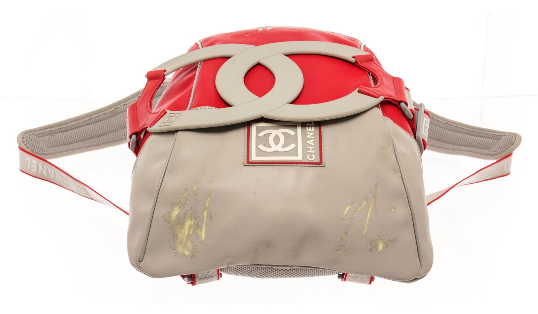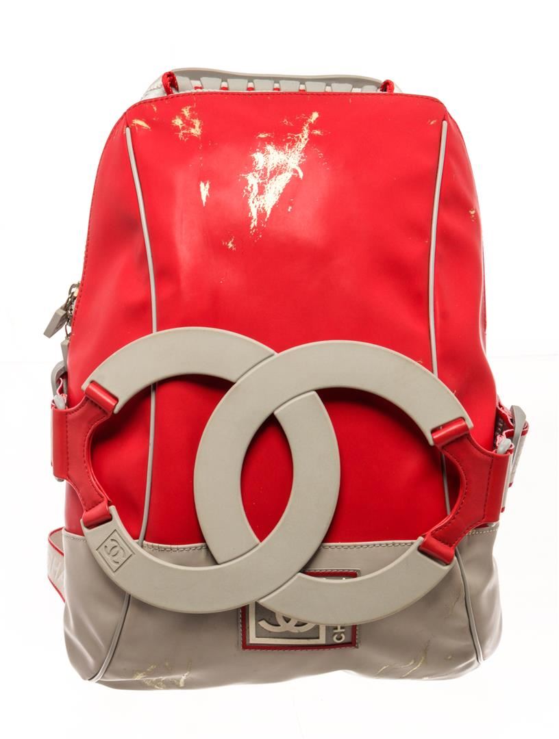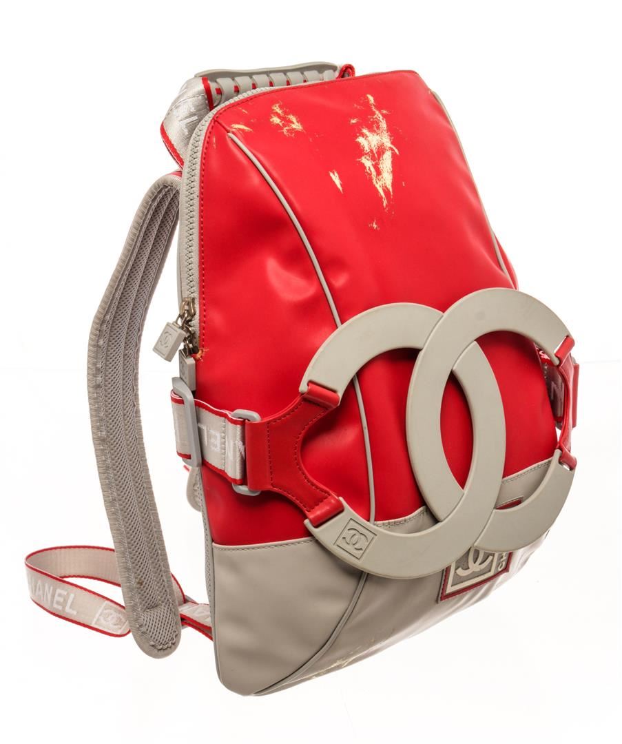 Chanel Line Bag Backpack. Brand: Chanel, Style: Line Bag, Type: Backpack, Exterior color: Red and Gray, Exterior material: Vinyl, Interior color: Gray, Interior material: Nylon, Length: 10, Width: 2, Height: 15. Item is sold AS-IS and all information pert