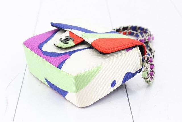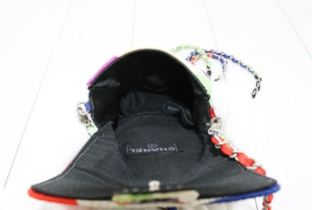 Chanel Mini Flap Bag Crossbody multi: white, black, red, green, blue, purple Canvas. Brand: Chanel, Style: Mini Flap Bag, Type: Crossbody, Exterior Color: multi: white, black, red, green, blue, purple, Exterior Material: Canvas, Exterior Pockets: None, Interior Color: black, Interior Material: canvas, Interior Pockets: None, Closure: SN/Ap Closure, Handle/Strap Type: braided canvas and chain, Length: 3 1/2, Width: 1 1/4, Height: 3, Strap Drop: 2N/A. Condition: general yellowing of white canvas. Item is sold AS-IS and all information pertaining to this lot is available in the photos or this description.