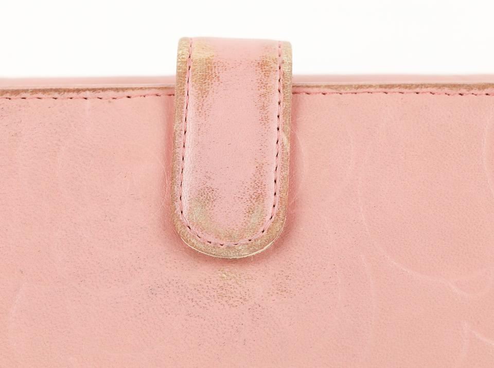 Chanel Camellia Leather Wallet Fold over and pull snap closure Silver-tone hardware Pink leather with Camellia embossed details 7 Interior credit card slots 3 Long bill slots 1 Gusset compartment along the main compartment The exterior has a gusset coin pocket with a snap-flap closure Made in Italy