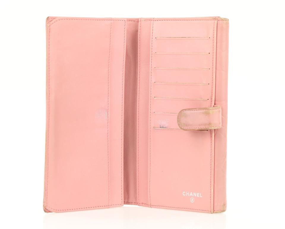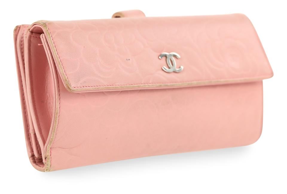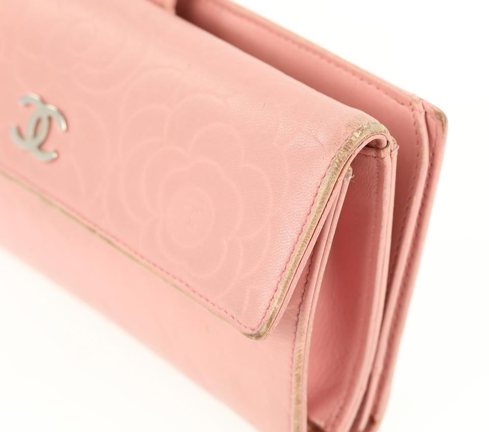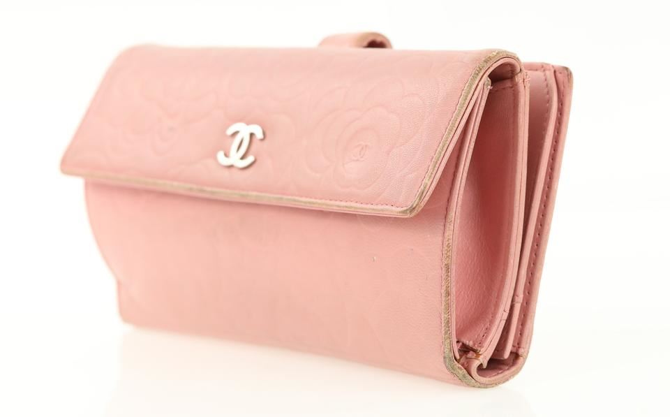 Chanel Camellia Leather Wallet Fold over and pull snap closure Silver-tone hardware Pink leather with Camellia embossed details 7 Interior credit card slots 3 Long bill slots 1 Gusset compartment along the main compartment The exterior has a gusset coin pocket with a snap-flap closure Made in Italy