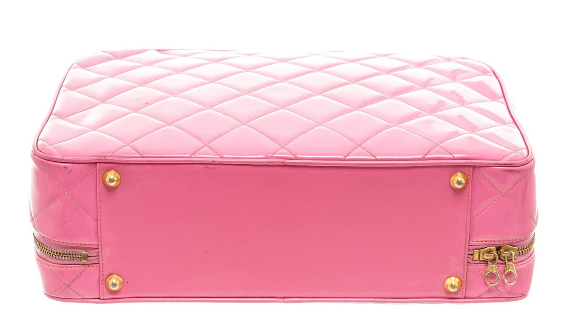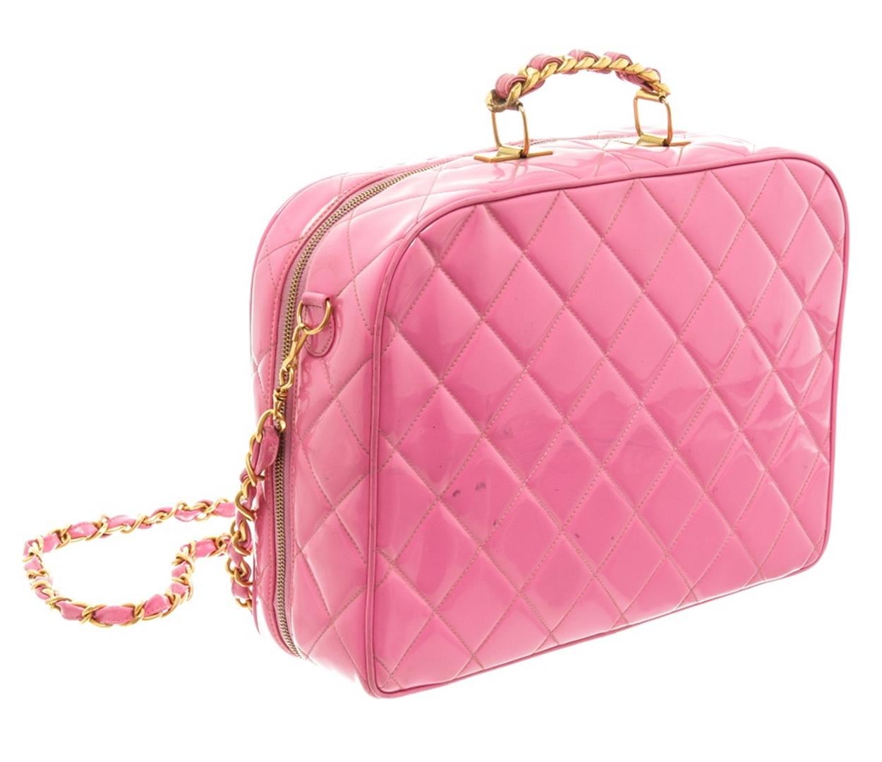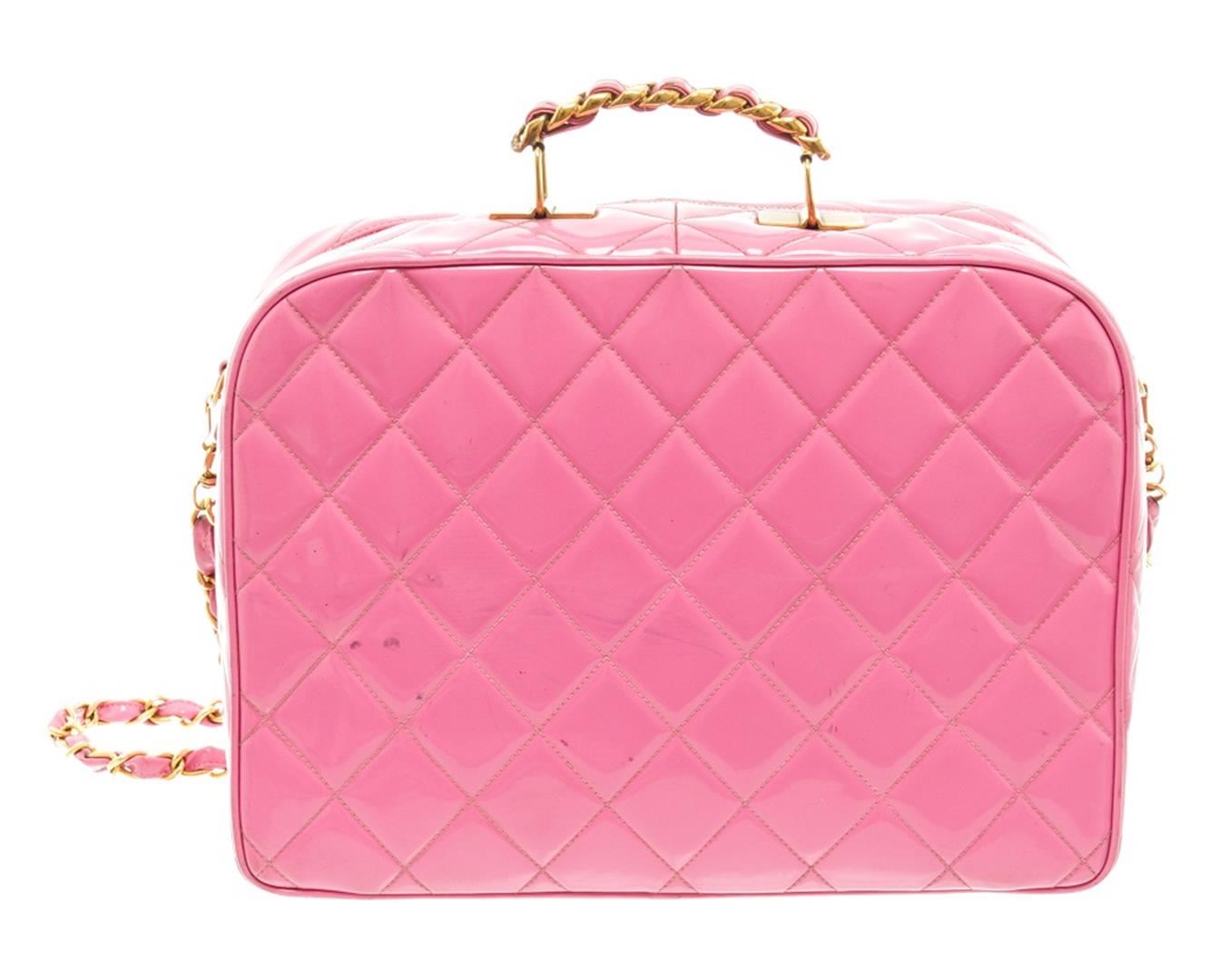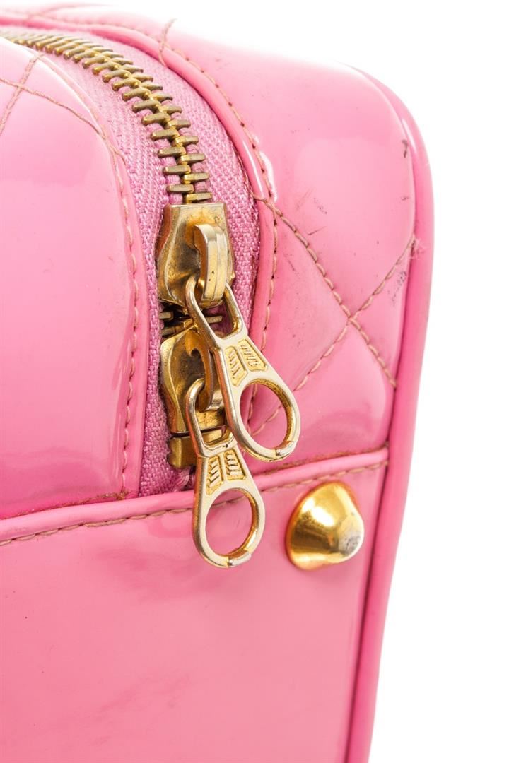 One Chanel Pink Quilted Patent Leather 2-Way Bag. Item is sold AS-IS. All available information is listed in the description and shown in the photo. Chanel pink quilted patent leather 2-way bag with gold-tone hardware, single top handle and a shoulder strap with woven leather and chain-link accent, protective feet at base, zip around closure, pink leather lining, one slip pocket, and one zip pocket on the interior wall. There is some wear on the leather lining, date code is intact and some markings on the patent leather as shown in pictures. There is creasing and color transfer. Height: 11" Width: 3.9" Depth: 8.3", Shoulder Drop: / 27.94 x 9.91 x 21.09 Cm