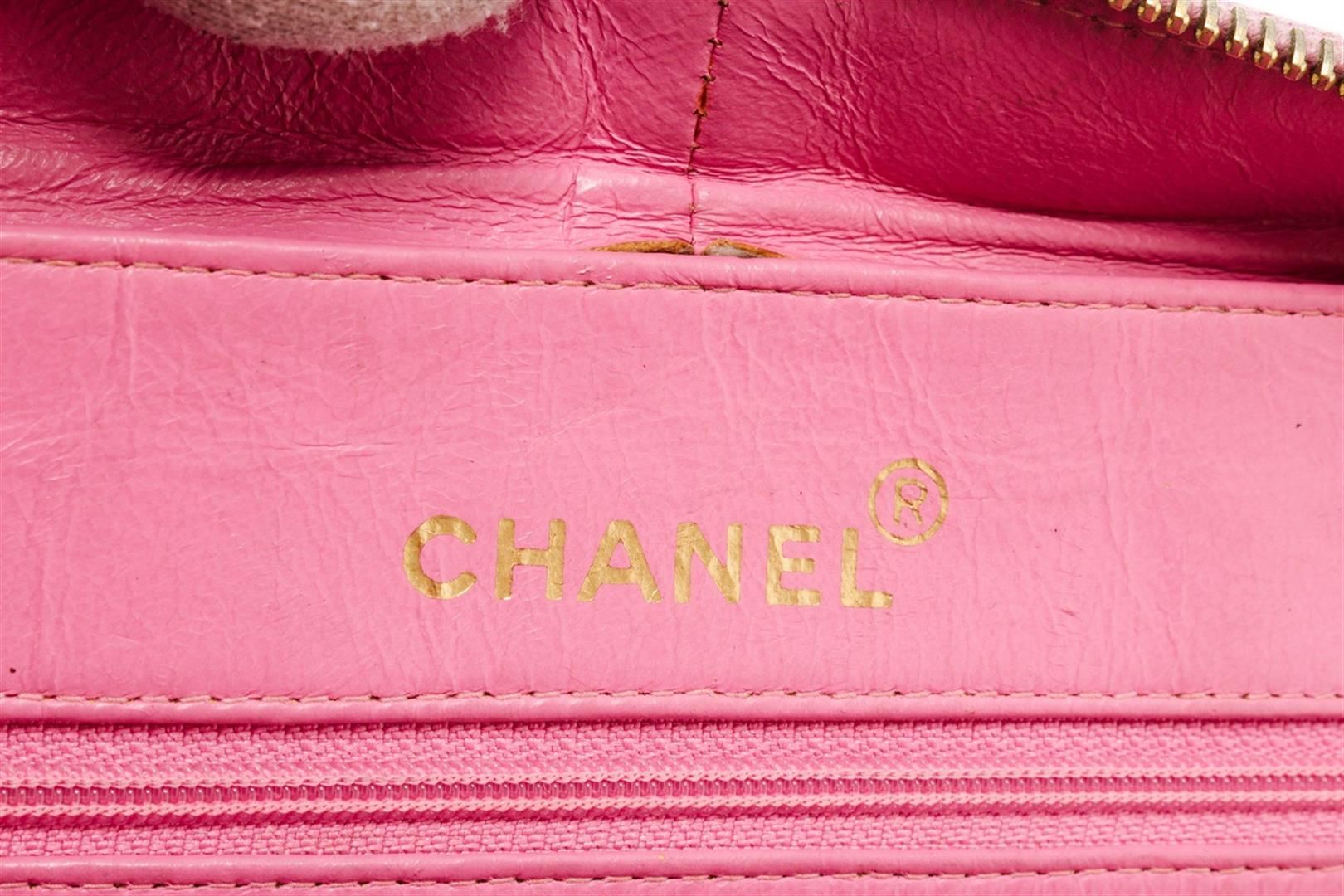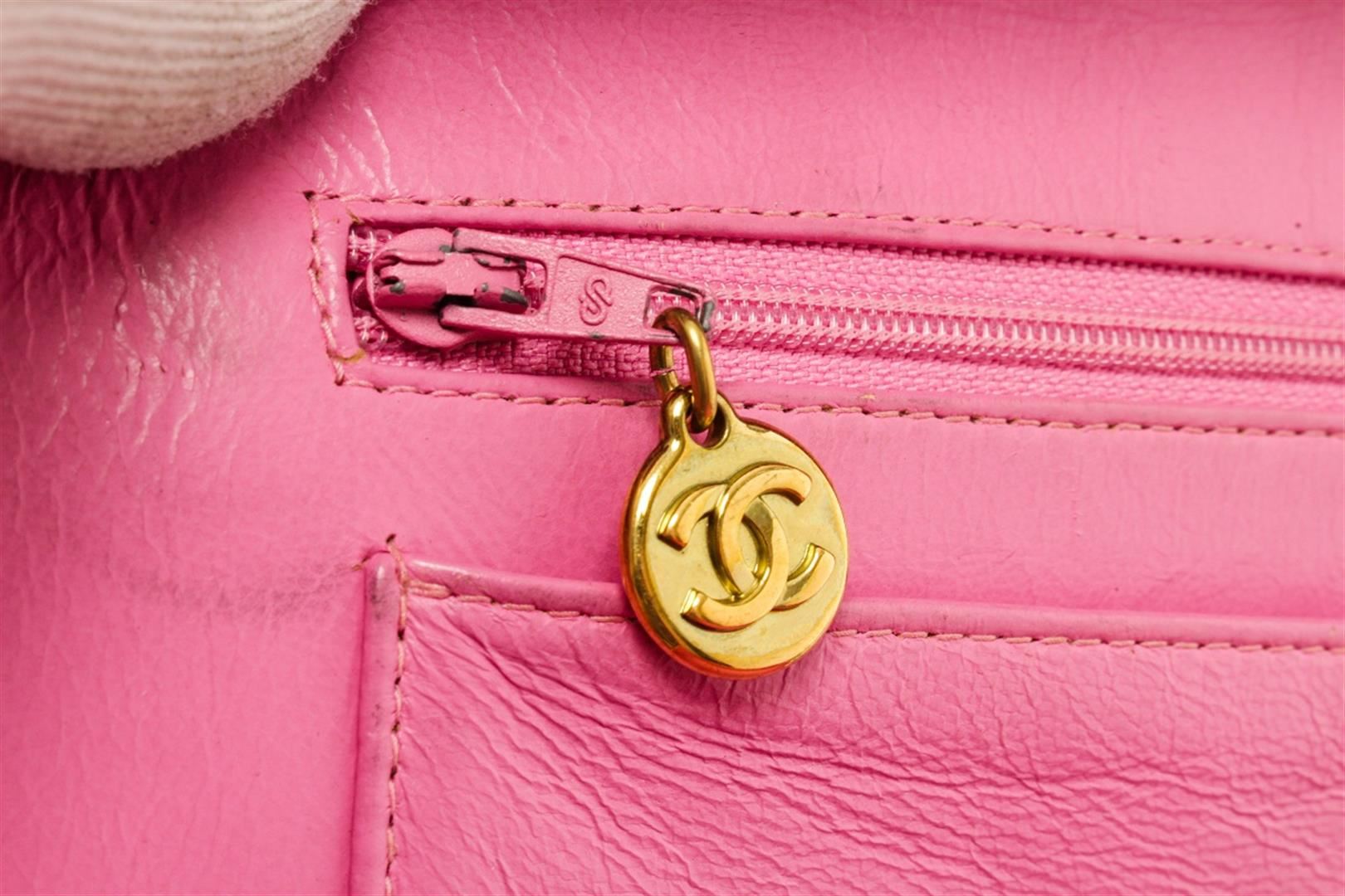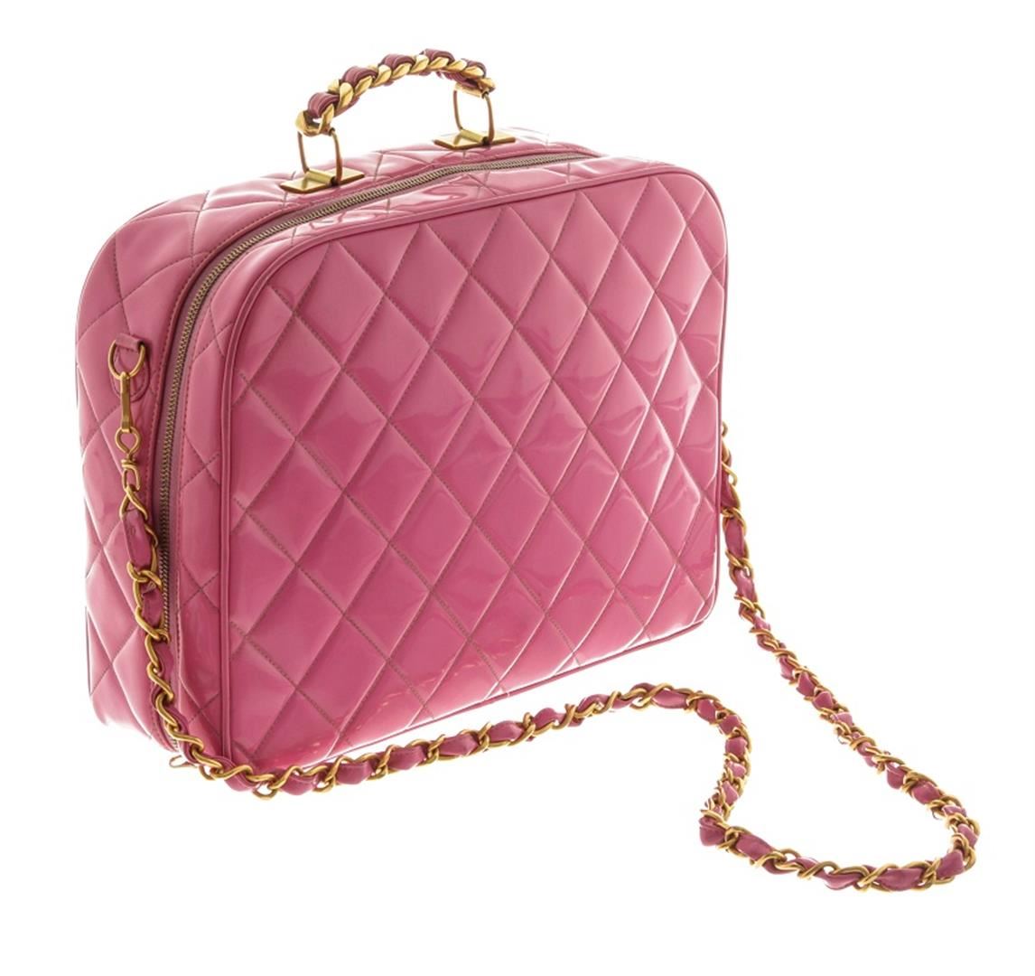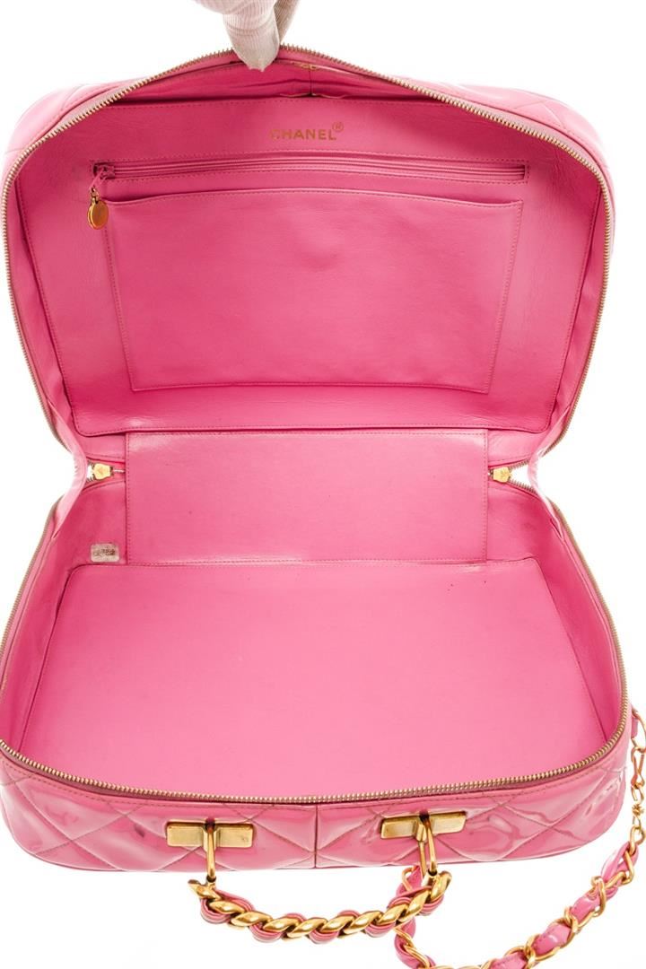 One Chanel Pink Quilted Patent Leather 2-Way Bag. Item is sold AS-IS. All available information is listed in the description and shown in the photo. Chanel pink quilted patent leather 2-way bag with gold-tone hardware, single top handle and a shoulder strap with woven leather and chain-link accent, protective feet at base, zip around closure, pink leather lining, one slip pocket, and one zip pocket on the interior wall. There is some wear on the leather lining, date code is intact and some markings on the patent leather as shown in pictures. There is creasing and color transfer. Height: 11" Width: 3.9" Depth: 8.3", Shoulder Drop: / 27.94 x 9.91 x 21.09 Cm