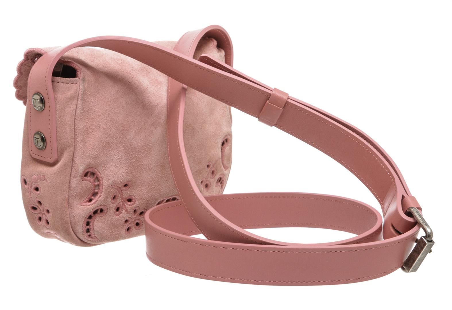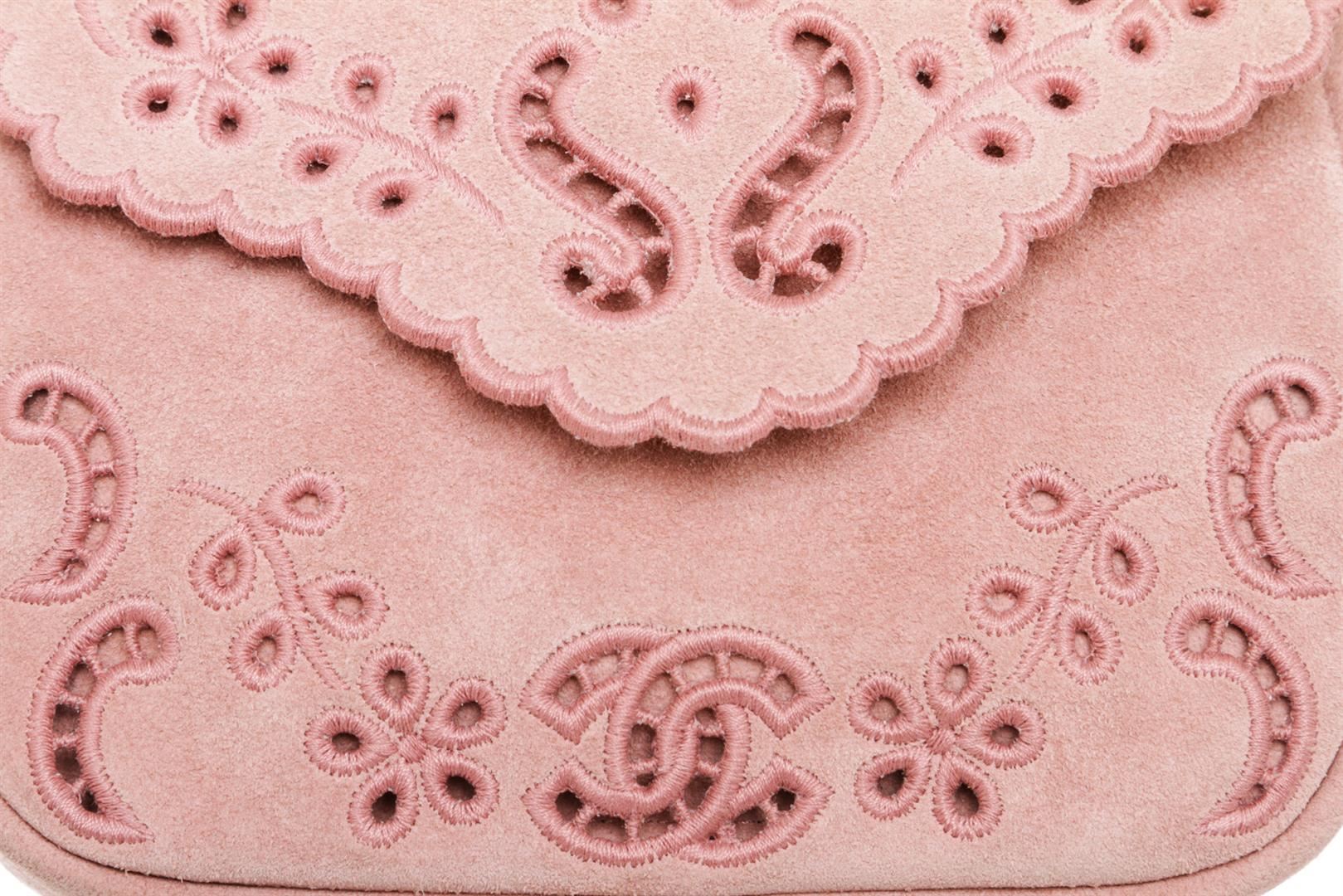 Pink suede Chanel Paris-Edinburgh Mini Highlander messenger bag with antiqued silver-tone hardware, single shoulder strap, crochet floral pattern at front face, tonal suede lining and flap closure at front.