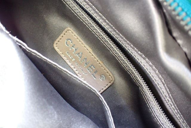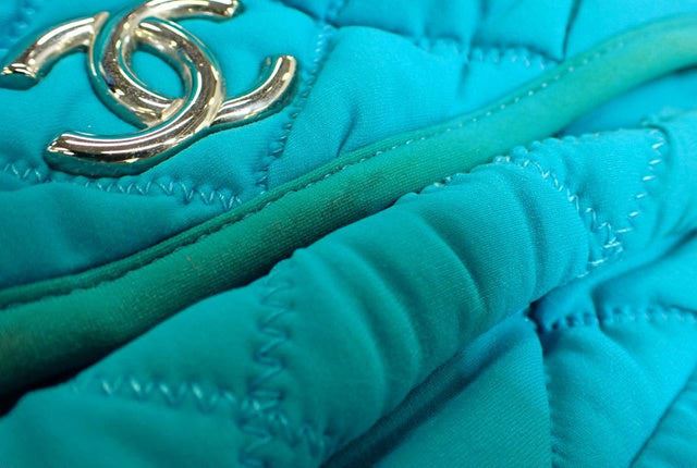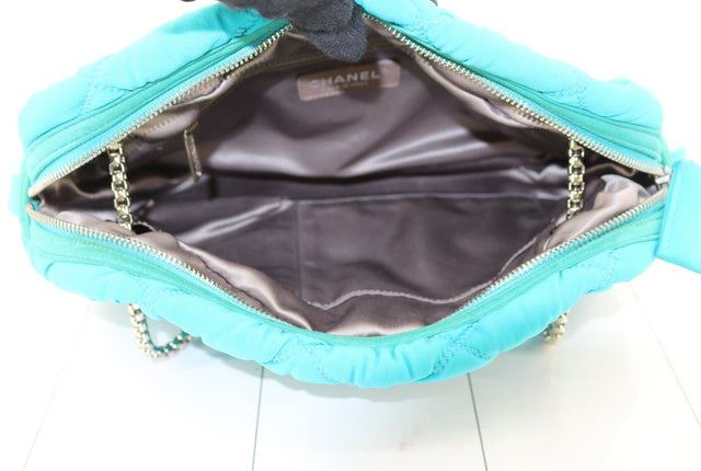 Chanel Quilted Bubble Chain Bag Shoulder Bag. Brand: Chanel, Style: Quilted Bubble Chain Bag, Type: Shoulder Bag, Exterior color: Blue, Exterior material: Jersey, Interior color: Black, Interior material: Satin, Length: 12, Width: 4, Height: 7. Item is so