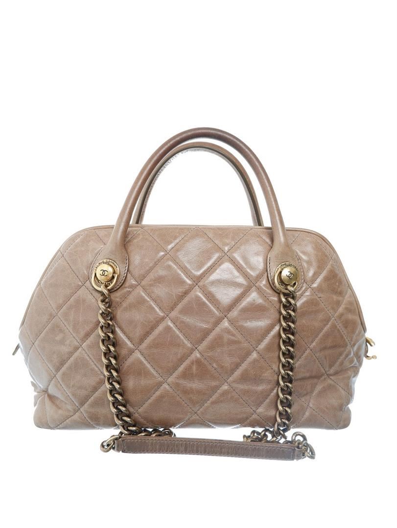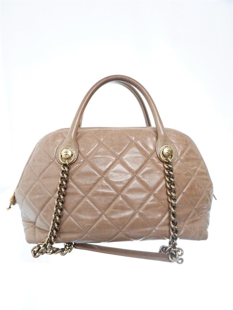 Chanel Quilted Castle Rock Brown Bowler Bag. All available information is listed in the description and shown in the photos. Brown quilted calfskin Chanel Castle Rock bowler bag features dual rolled leather top handles, dual chain-link shoulder straps with leather pads, CC zip pull charm and gold-tone hardware, zip closure opens to a maroon fabric interior with zip and slip pockets. 12" x 5.5" x 8" / 30.48cm x 13.97cm x 20.32cm