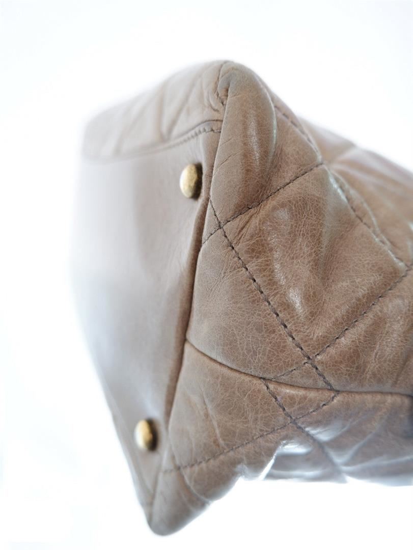 Chanel Quilted Castle Rock Brown Bowler Bag. All available information is listed in the description and shown in the photos. Brown quilted calfskin Chanel Castle Rock bowler bag features dual rolled leather top handles, dual chain-link shoulder straps with leather pads, CC zip pull charm and gold-tone hardware, zip closure opens to a maroon fabric interior with zip and slip pockets. 12" x 5.5" x 8" / 30.48cm x 13.97cm x 20.32cm
