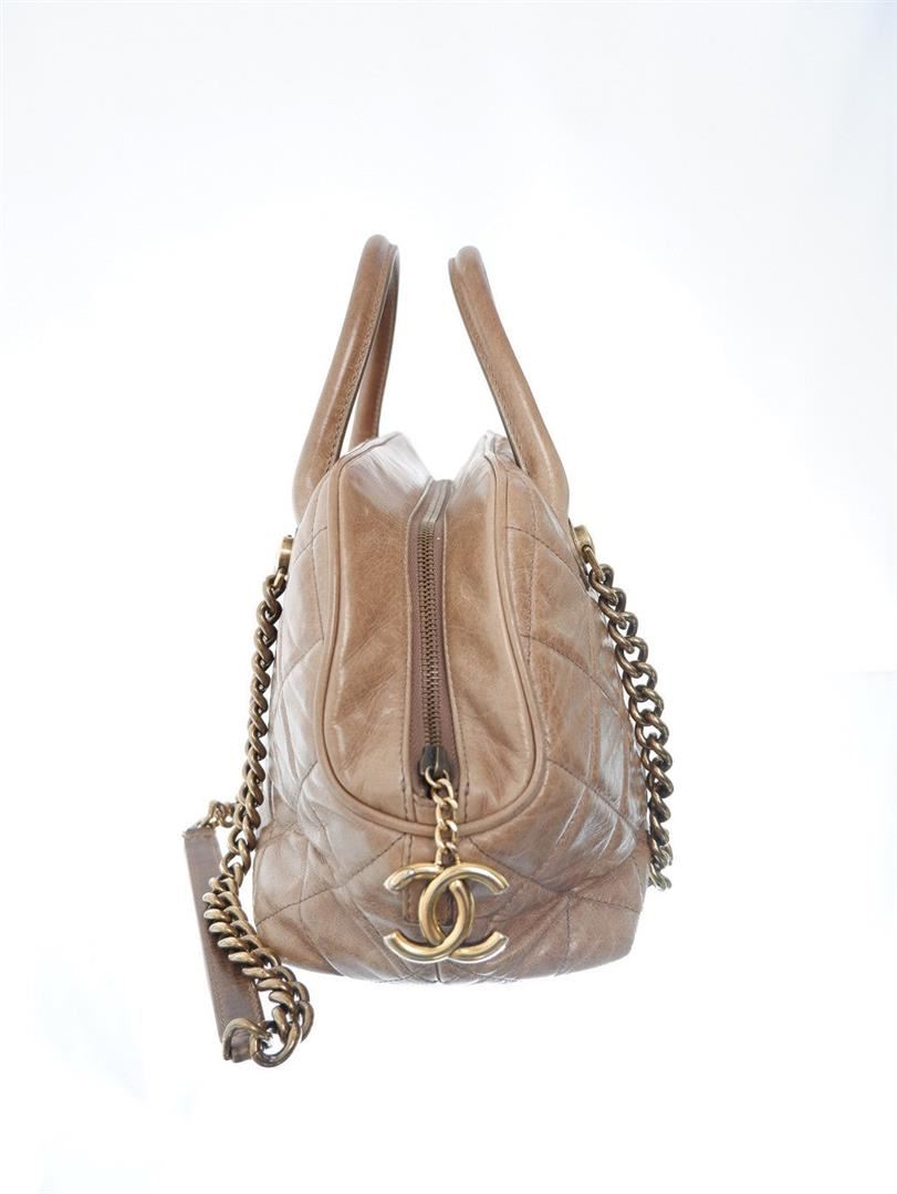 Chanel Quilted Castle Rock Brown Bowler Bag. All available information is listed in the description and shown in the photos. Brown quilted calfskin Chanel Castle Rock bowler bag features dual rolled leather top handles, dual chain-link shoulder straps with leather pads, CC zip pull charm and gold-tone hardware, zip closure opens to a maroon fabric interior with zip and slip pockets. 12" x 5.5" x 8" / 30.48cm x 13.97cm x 20.32cm