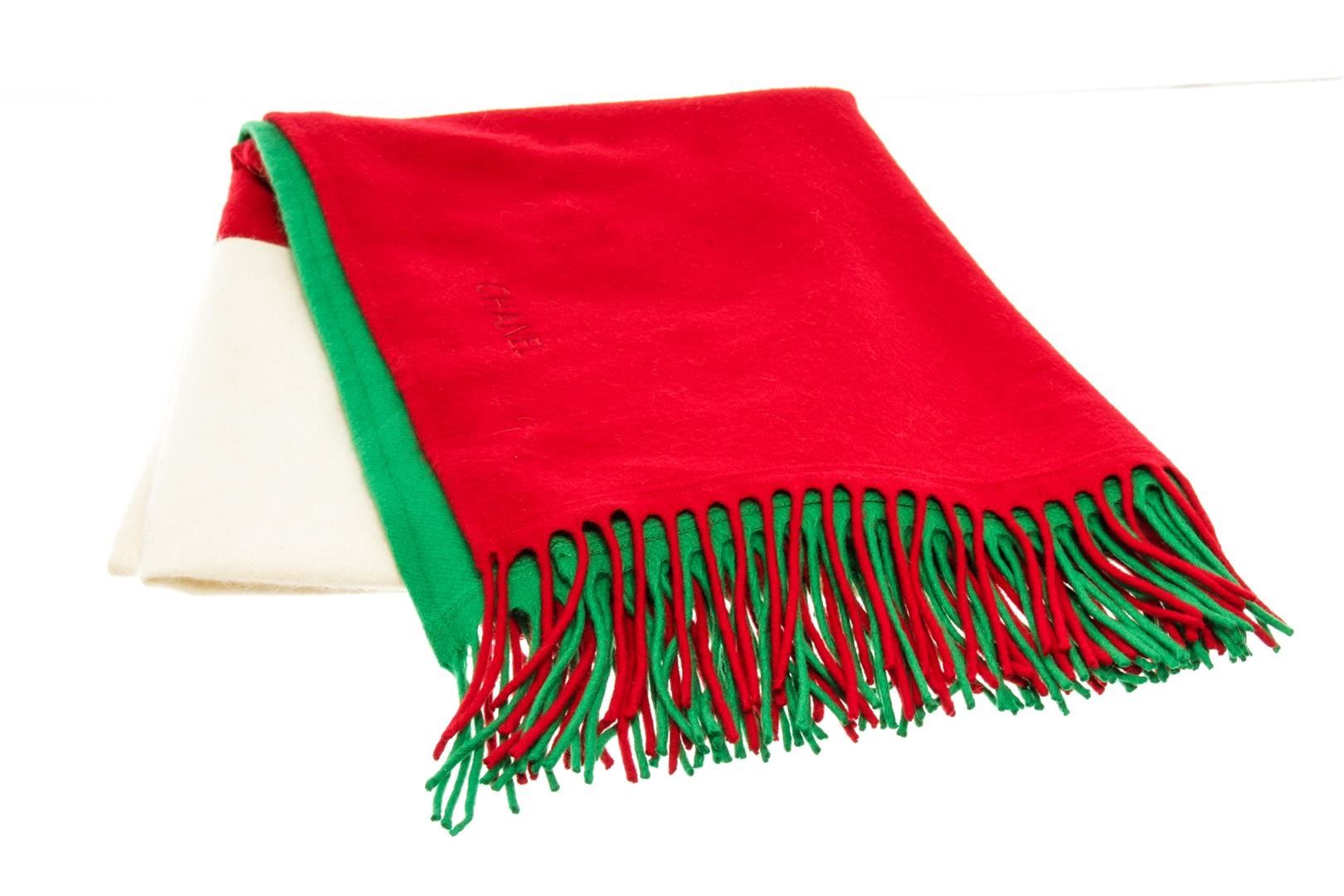 One Chanel Red Italian Flag Shawl. Item is sold AS-IS. All available information is listed in the description and shown in the photo. Chanel Red Italian Flag Shawl