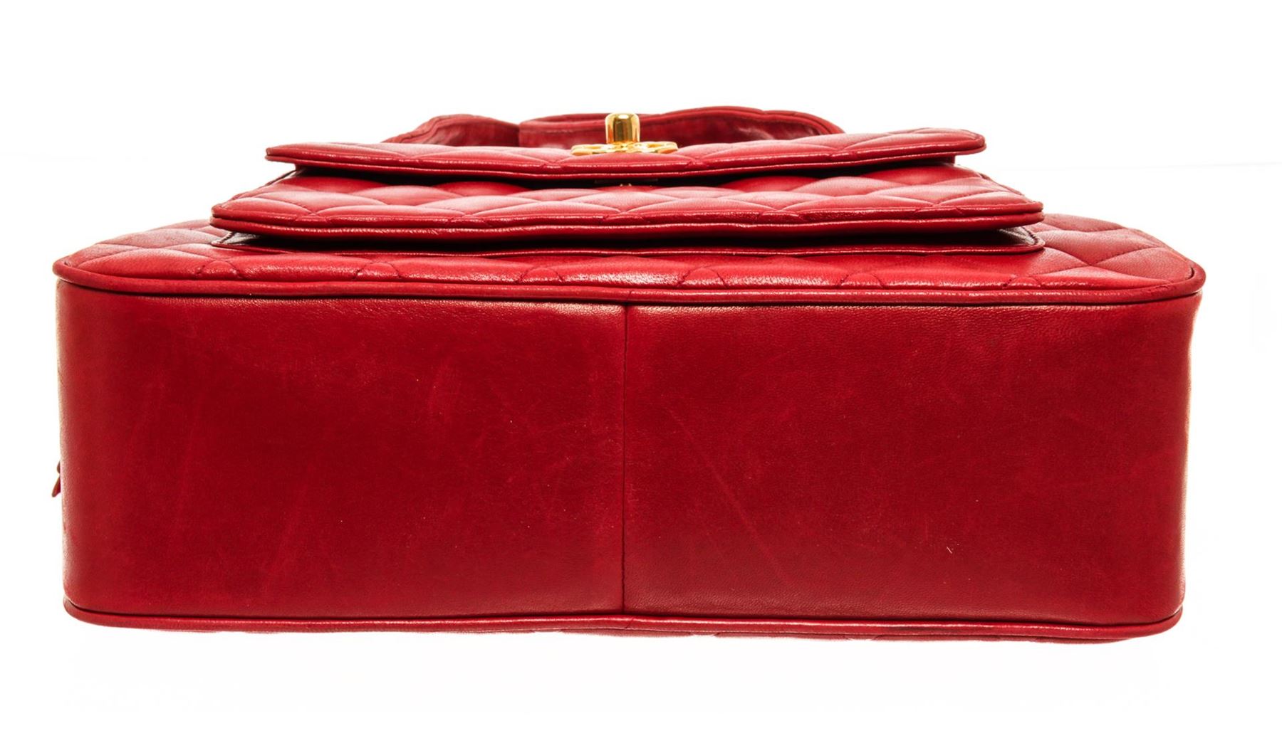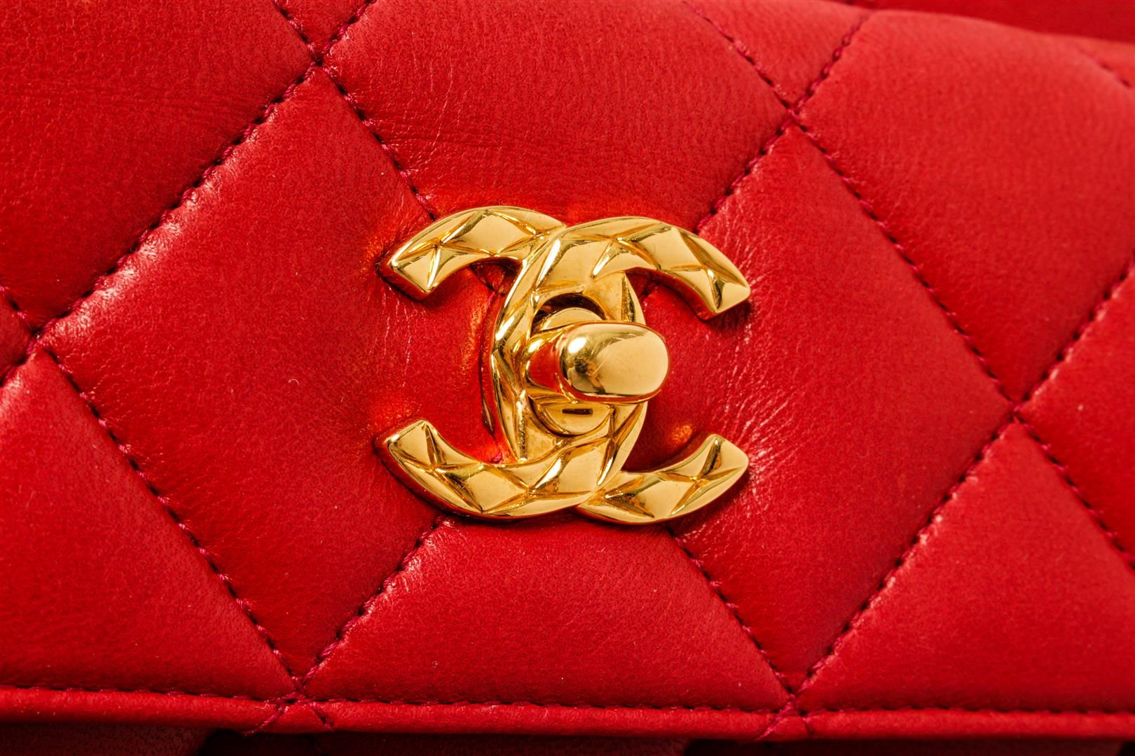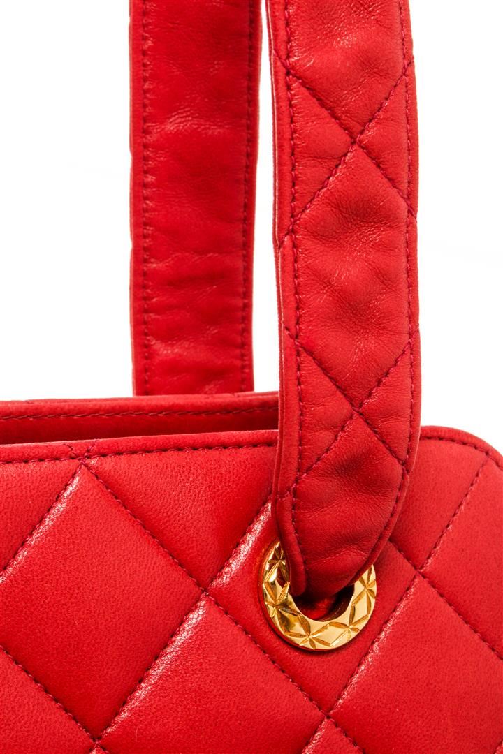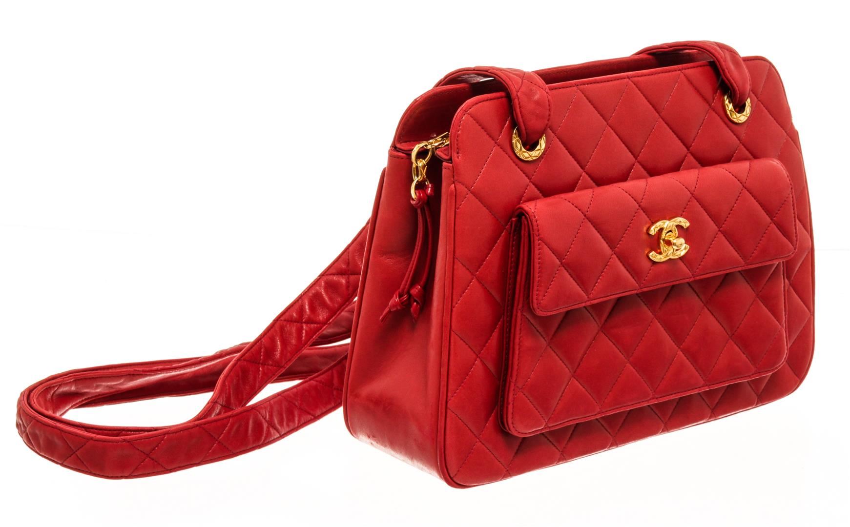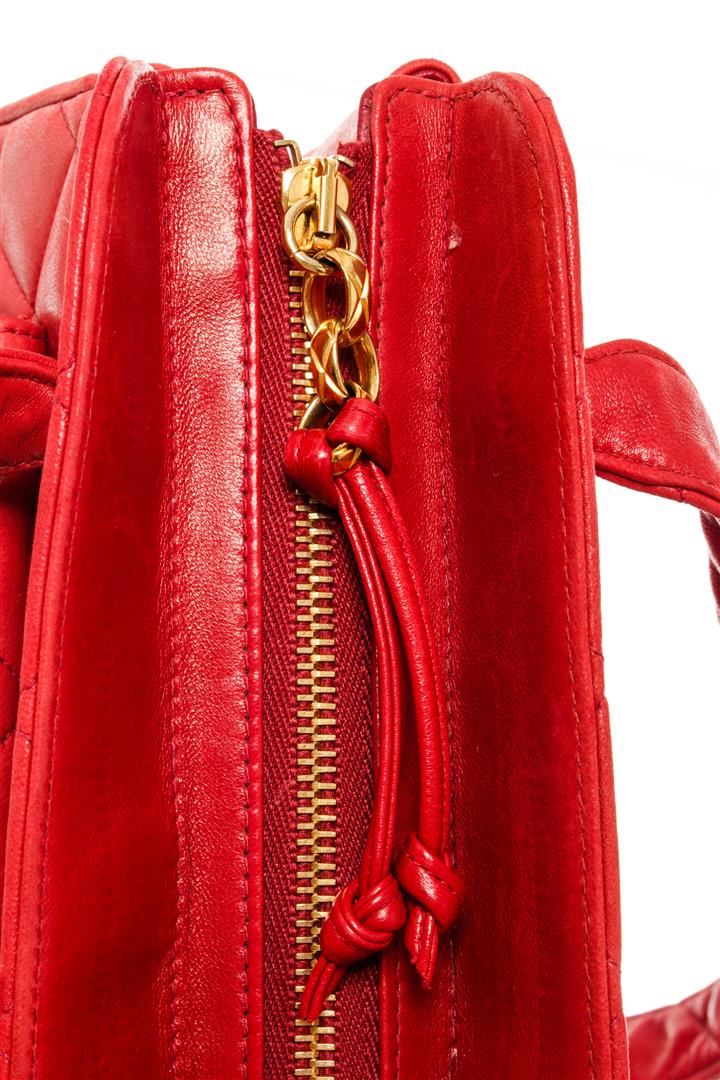 One Chanel Red Lambskin CC Front Pocket Shoulder Bag. Item is sold AS-IS. All available information is listed in the description and shown in the photo. Chanel red lambskin CC front pocket shoulder bag with quilted red leather exterior, red leather lining, gold-tone hardware, one exterior compartment with a flap and turn-lock closure, a gold CC logo, two red quilted leather top handles, one slip pocket on the back, zipper closure, one main compartment, and two interior pockets: one slip and one zip. The strap is worn with some creasing. Please refer to photos. Height: 8.66" Width: 11.02" Depth: 3.34", Strap Length: 42.91" / 22 x 28 x 8.5 Cm