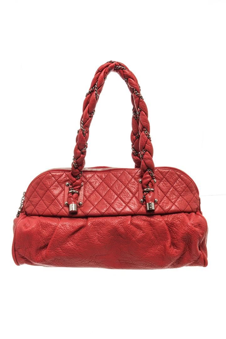One Chanel Red Leather Large Lady Braid Bowler Bag. Item is sold AS-IS. All available information is listed in the description and shown in the photo. Chanel red leather large lady braid bowling bag with red lambskin exterior, silver-tone hardware, dual leather-chain shoulder straps, brown satin lining, zip closure, interlocking CC logo on the zipper tab, and two interior pockets: one zip and one slip. Height: 12 in (30.48 cm), Width: 18 in (45.72 cm), Depth: 5.5 in (13.97 cm)
