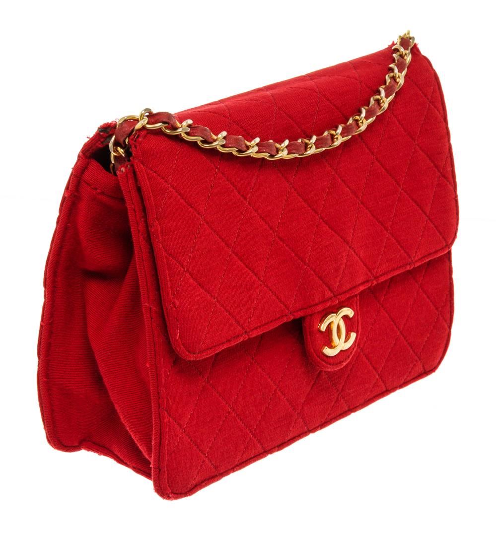 One Chanel Red Quilted Fabric Single Flap Bag. Item is sold AS-IS. All available information is listed in the description and shown in the photo. Chanel Red Quilted Fabric Single Flap Bag with gold-tone hardware, red leather lining, interior zip pocket, chain leather shoulder strap, and flap closure with CC turn-lock. .
