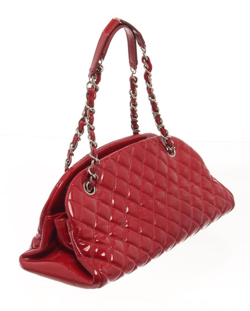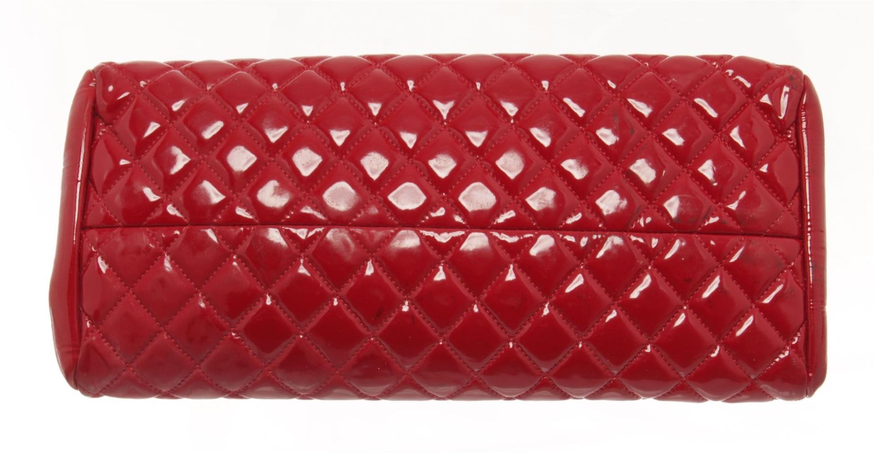 Chanel Red Quilted Patent Bowling Chain Shoulder Bag. All available information is listed in the description and shown in the photos. patent leather threaded silver shoulder straps with patent leather shoulder pads and a dangling silver Chanel CC medallion. The top is open to red fabric multiple compartments with a zippered closure. Height: 5.25 in, Width: 4.50 in, length: 10.50 in/ 13.33 x 11.43 x 26.67 CM