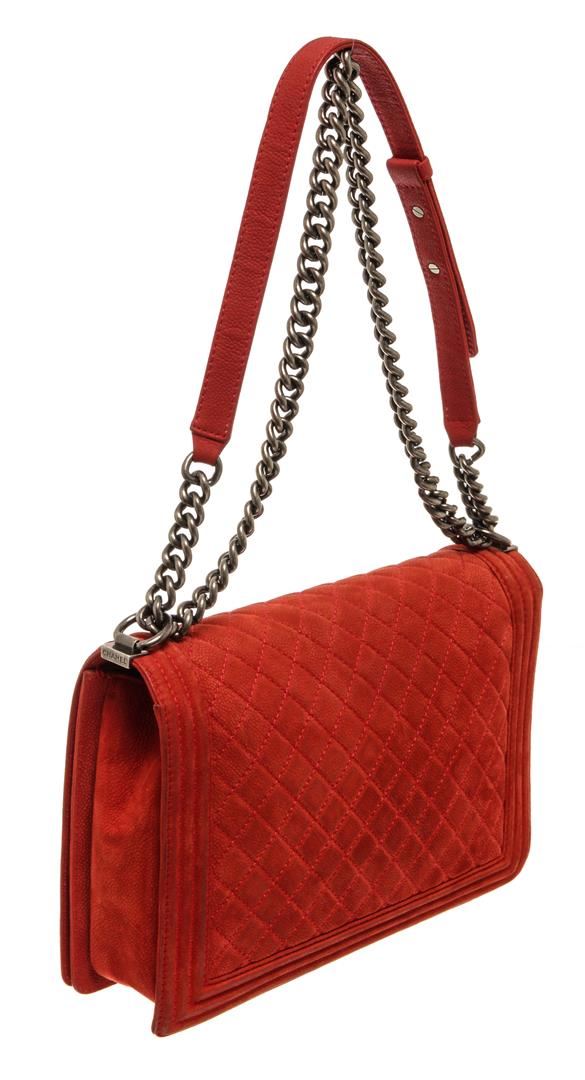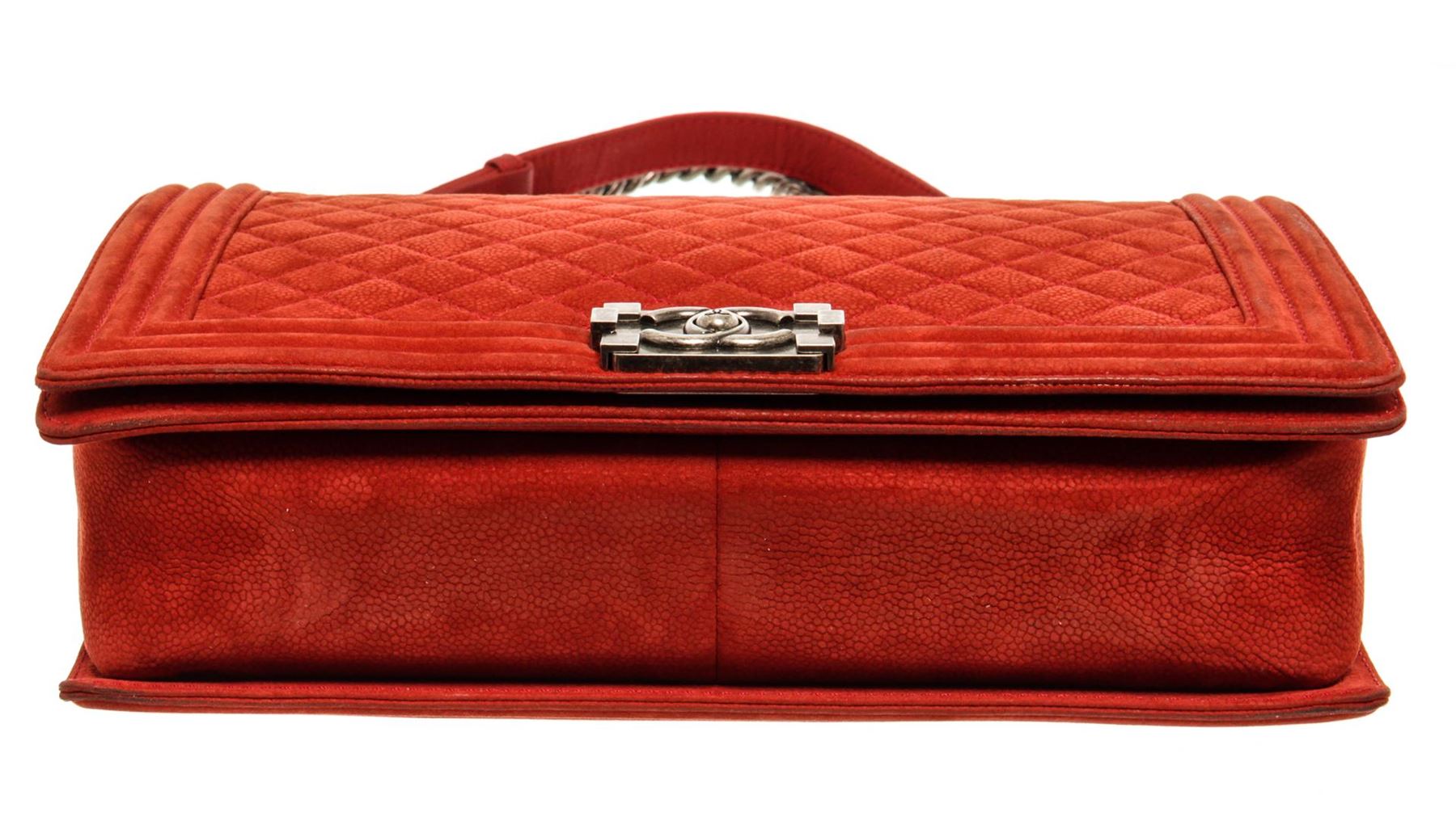 One Chanel Red Soft Matte Caviar Leather Boy Large Flap Bag. Item is sold AS-IS. All available information is listed in the description and shown in the photo. Chanel Red Soft Matte Caviar Leather Boy Large Flap Bag with aged silver-tone hardware, red canvas lining, interior slip and zipper pockets, chain leather shoulder strap, and flap closure with CC push lock. .