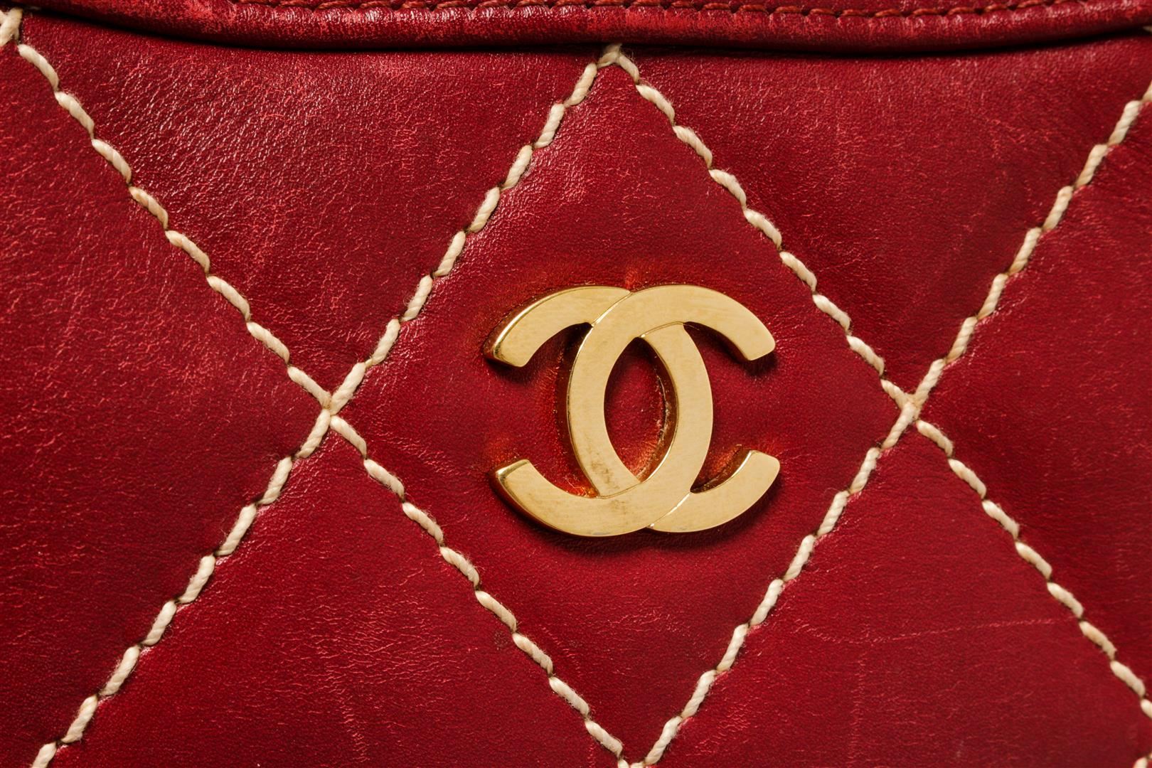 One Chanel Red Wild Stitch Tote Bag. Item is sold AS-IS. All available information is listed in the description and shown in the photo. Chanel red wild stitch tote bag with red leather exterior, contrasting white quilted stitching on the exterior, two top handles, gold-tone hardware, zip closure, red CC logo patterned fabric lining, and one interior zip pocket. There is some fading on the leather. Please refer to photos. Height: 9.45" Width: 4.73" Length: 13", Handle Drop: / 24 x 12 x 33 Cm