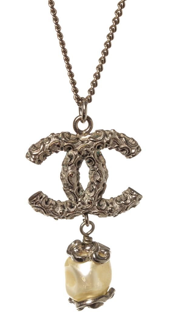 Chanel Silver CC Logo Pearl Drop Necklace. All available information is listed in the description and shown in the photos. Chanel Silver CC Pearl Drop Necklace with a faux pearl, silver tone metal hardware and logo, adjustable chain length (42cm-60cm).