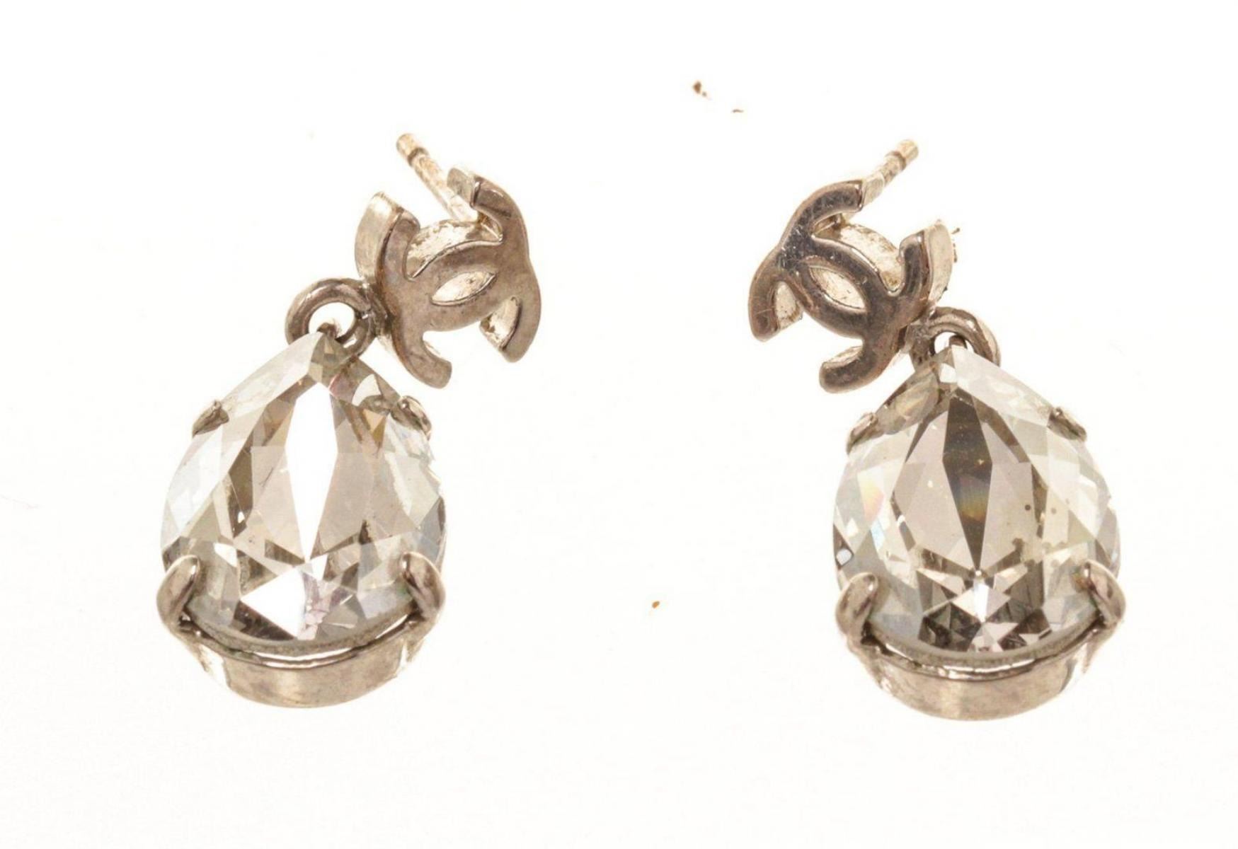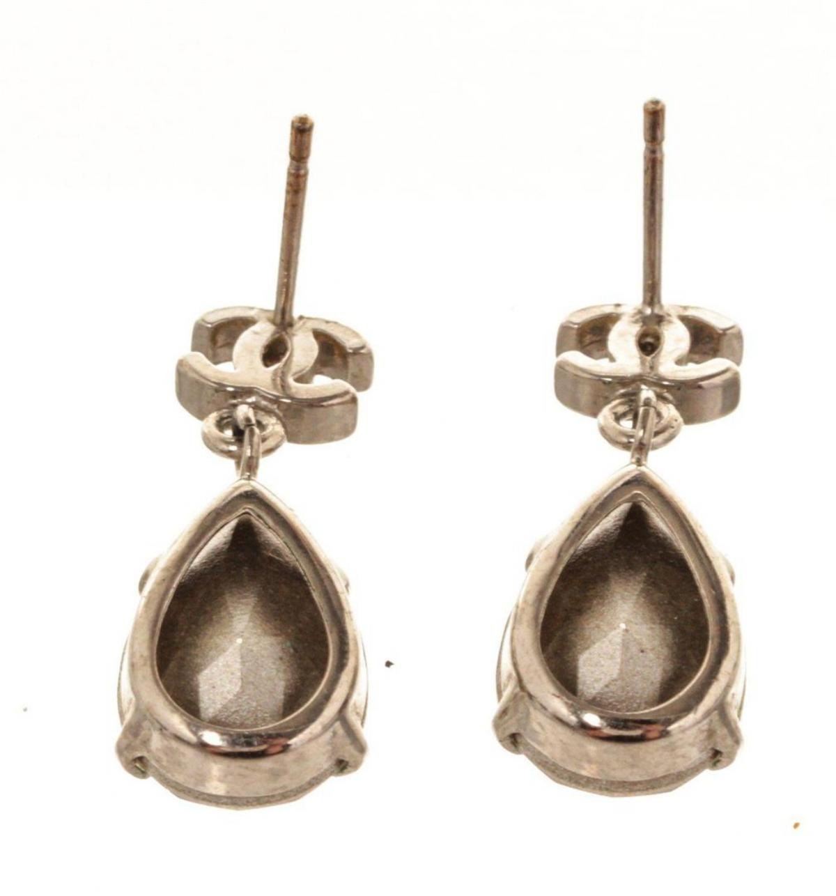 Chanel Silver CC Rhinestone Earrings with silver-tone hardware.
