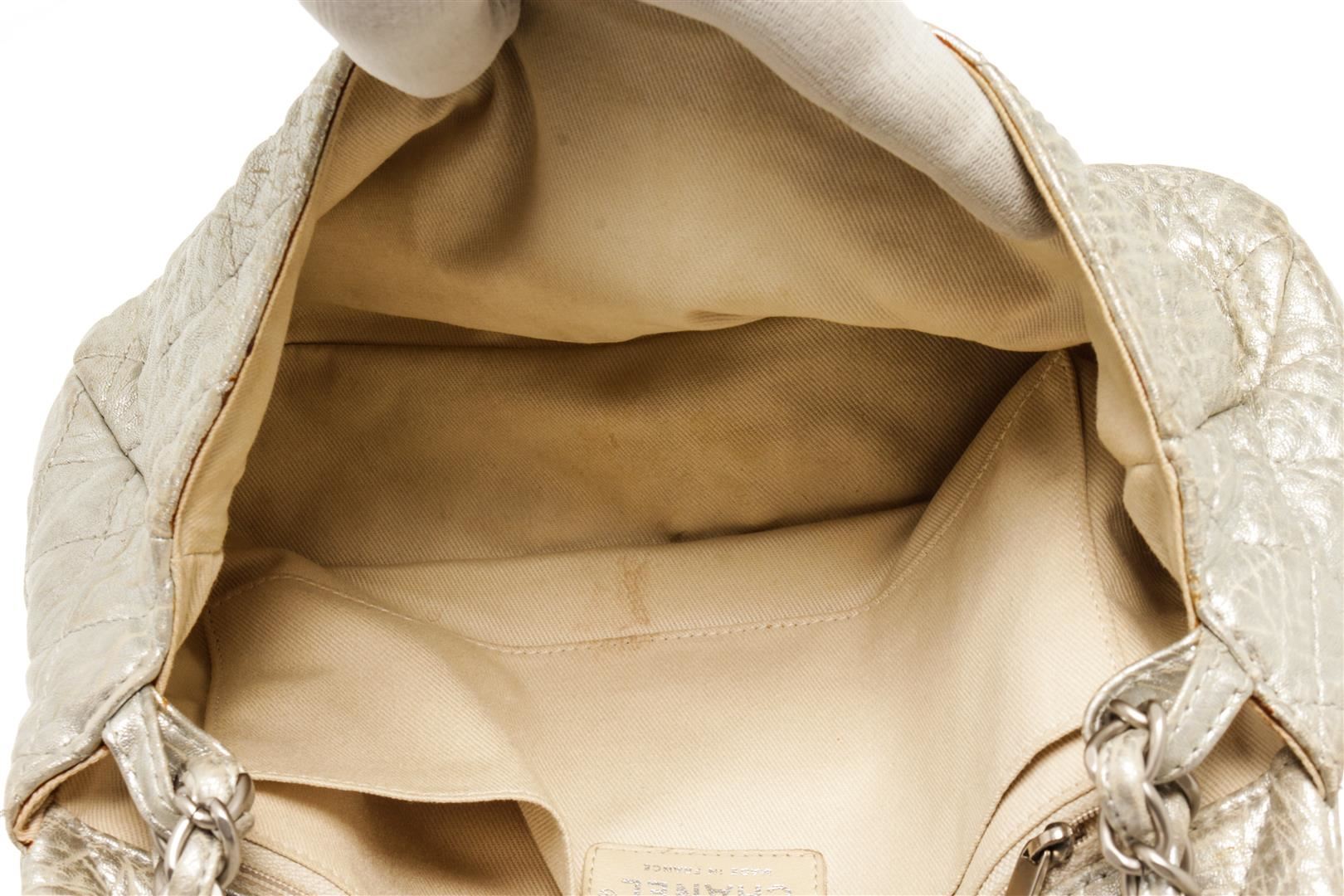 One Chanel Silver Crinkle Flap Shoulder Bag. Item is sold AS-IS. All available information is listed in the description and shown in the photo. Chanel Silver Crinkle Flap Shoulder Bag with chain shoulder bag, fabric lining, interior pockets, turn lock closure. This item is in fair condition. Please refer to photos