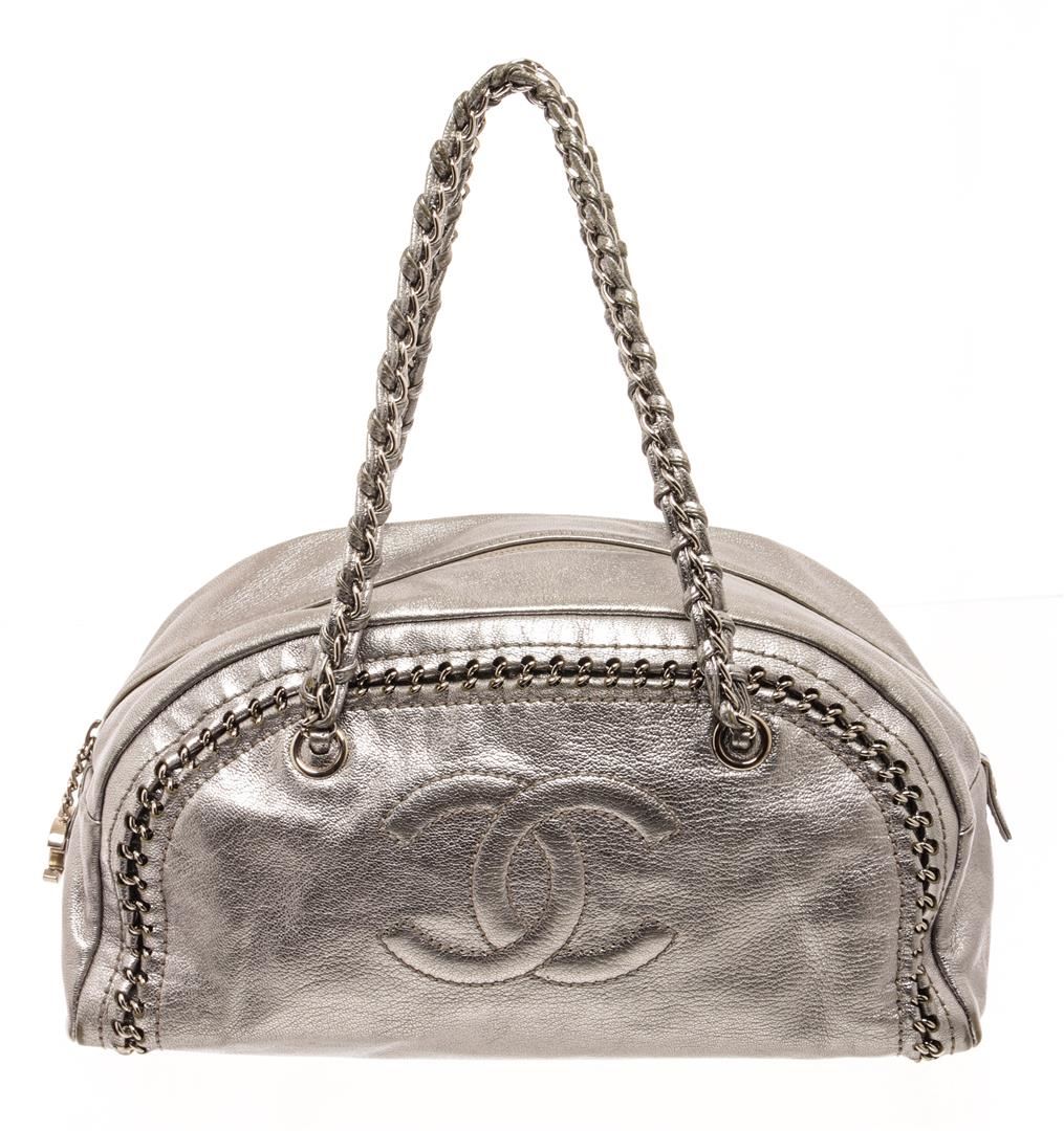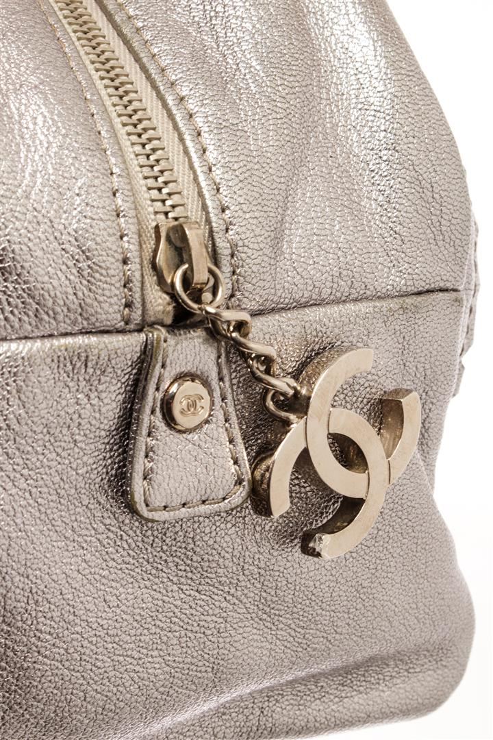 Chanel Silver Leather Doctor Shoulder Bag. All available information is listed in the description and shown in the photos. Chanel Silver Leather Doctor Shoulder Bag with silver grained leather exterior, silver chain strap, leather lining, interior pocket, zipper closure. There are some markings on the lining as shown in photos. W 16 x H 9.5 x D 7.4 inches. Handle Drop: 6 inches / 40.64 x 24.13 x 18.79 CM