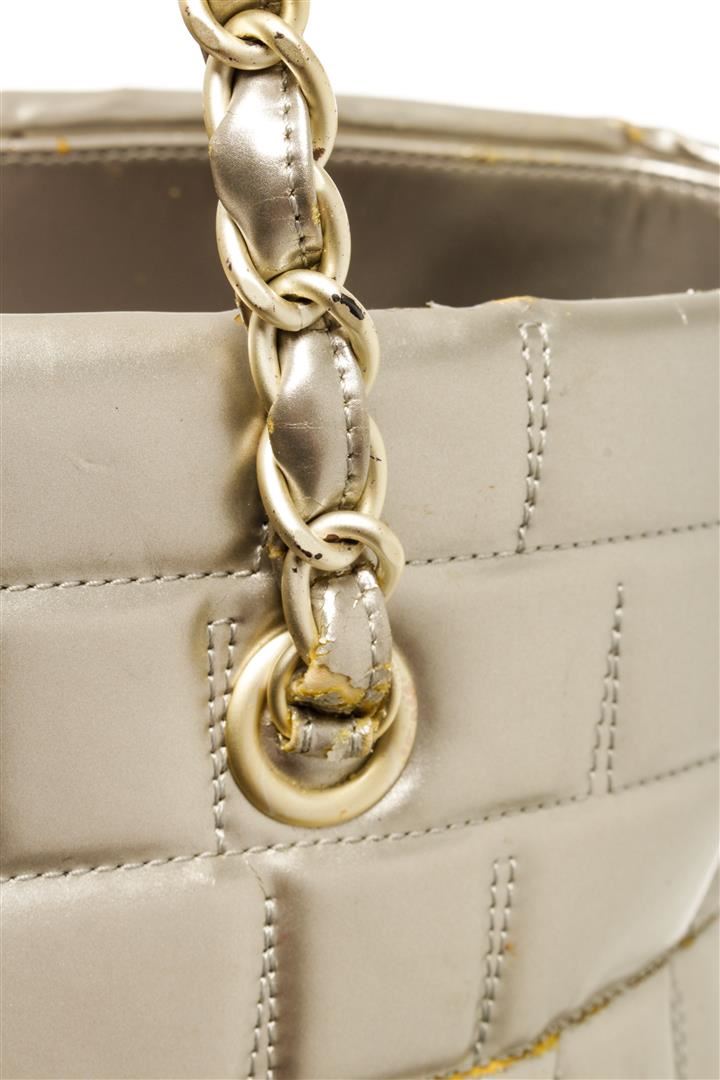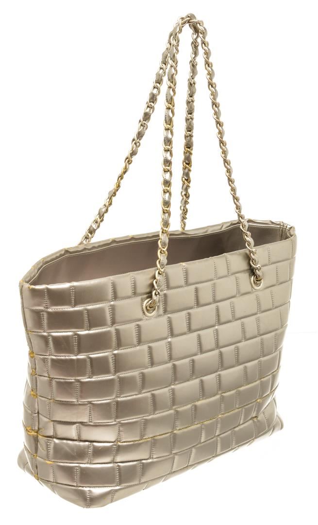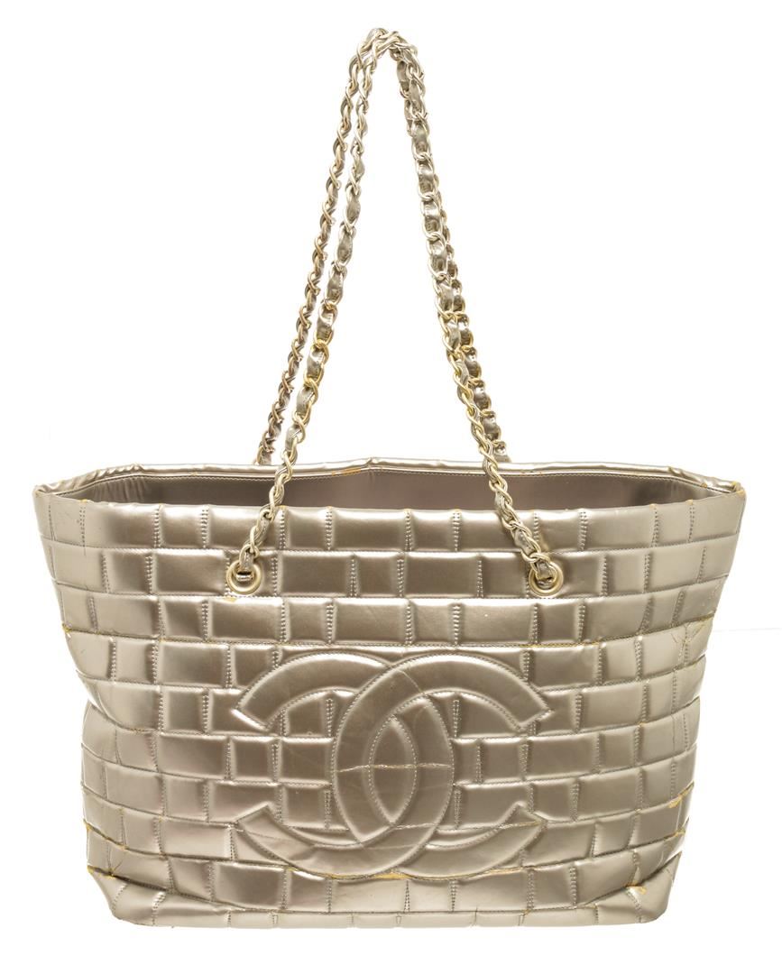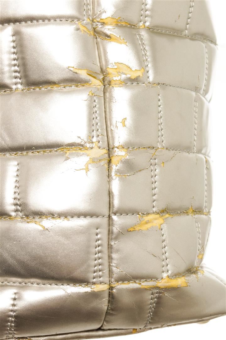 Chanel Silver Quilted Lambskin Igloo Tote Bag. All available information is listed in the description and shown in the photos. Chanel Silver Quilted Lambskin Igloo Tote Bag with gold-tone hardware, oversized CC interlocking logo at the front, foot base, grey satin lining, interior zip pocket, dual leather-woven chain shoulder strap, and zip closure at the top. PLEASE NOTE: a lot of silver peeling throughout the creases of the bag. .