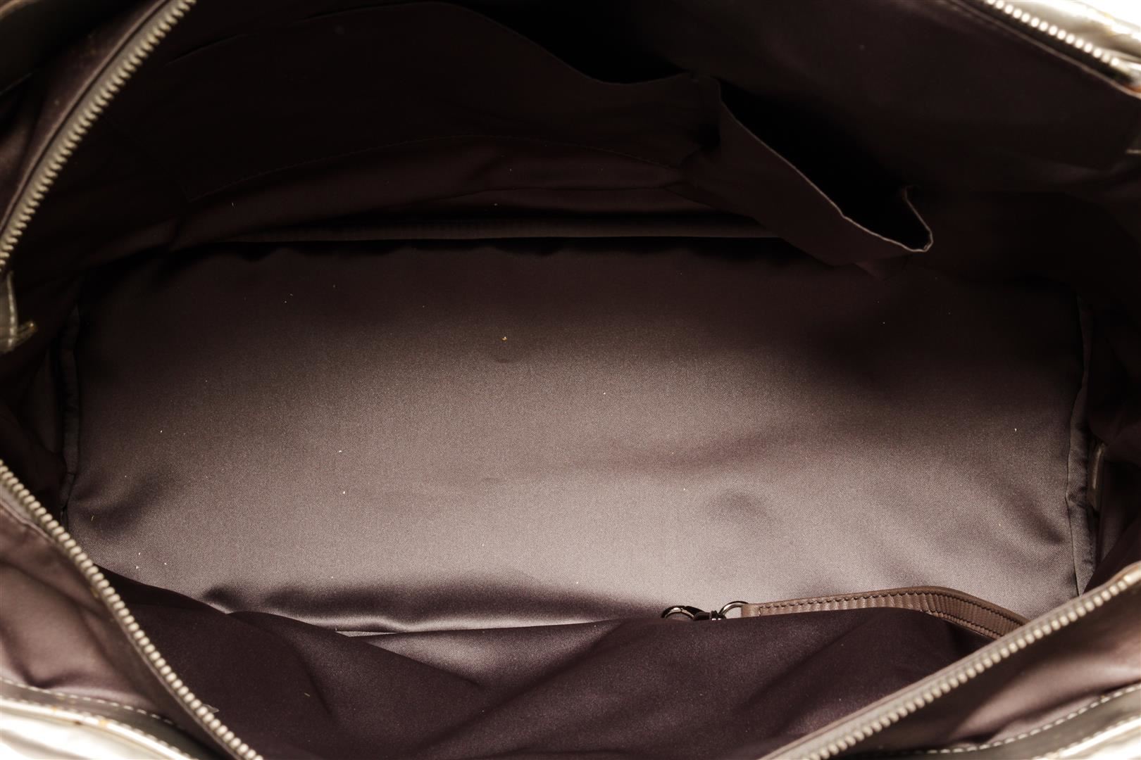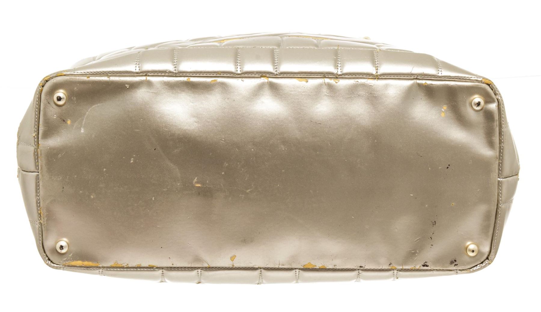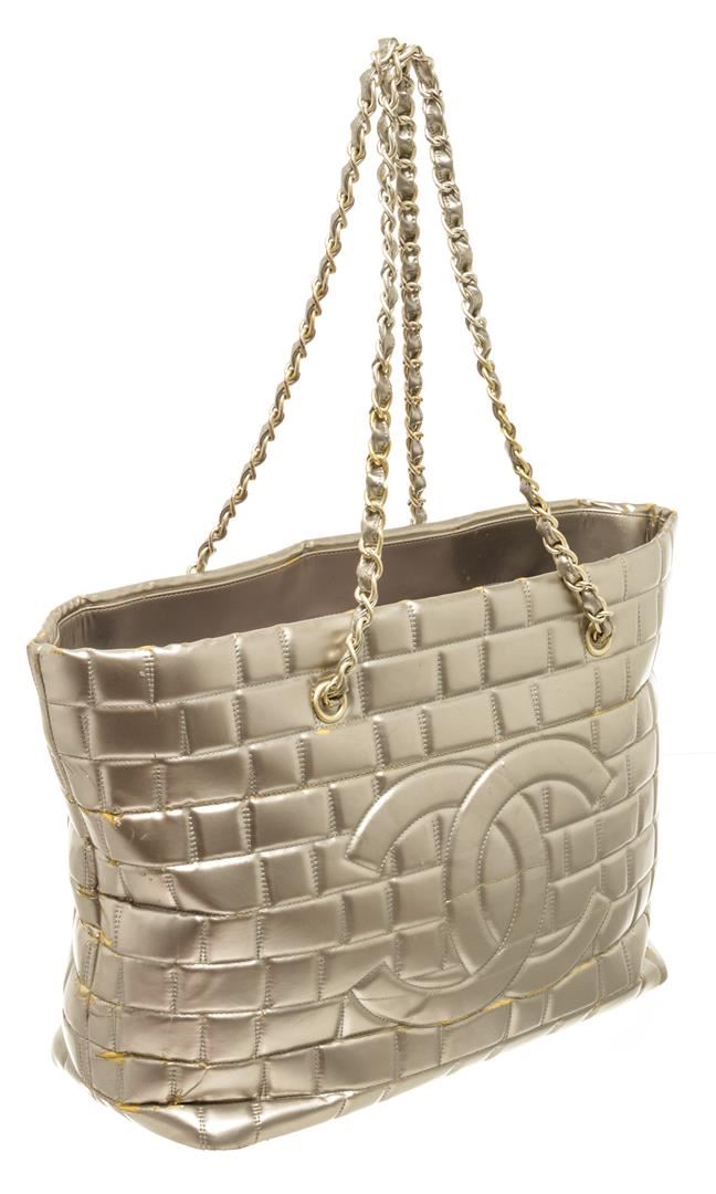 Chanel Silver Quilted Lambskin Igloo Tote Bag. All available information is listed in the description and shown in the photos. Chanel Silver Quilted Lambskin Igloo Tote Bag with gold-tone hardware, oversized CC interlocking logo at the front, foot base, grey satin lining, interior zip pocket, dual leather-woven chain shoulder strap, and zip closure at the top. PLEASE NOTE: a lot of silver peeling throughout the creases of the bag. .