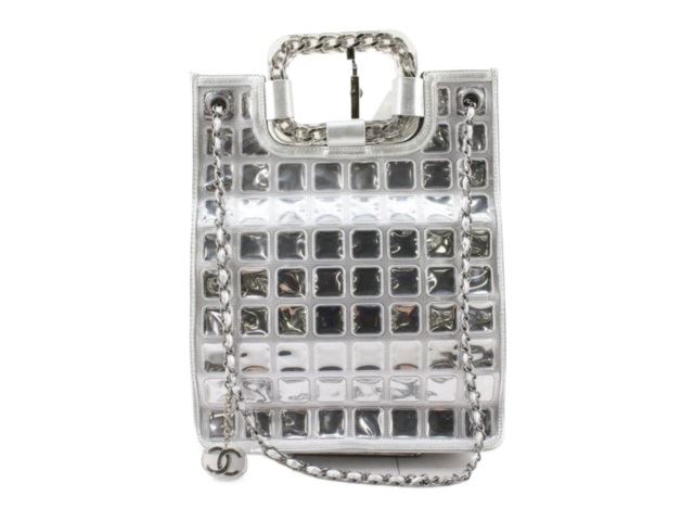 One Chanel Silver Vinyl PVC Chocolate Bar Ice Cube Chain Shoulder Bag. Item is sold AS-IS. All available information is listed in the description and shown in the photo. Vinyl