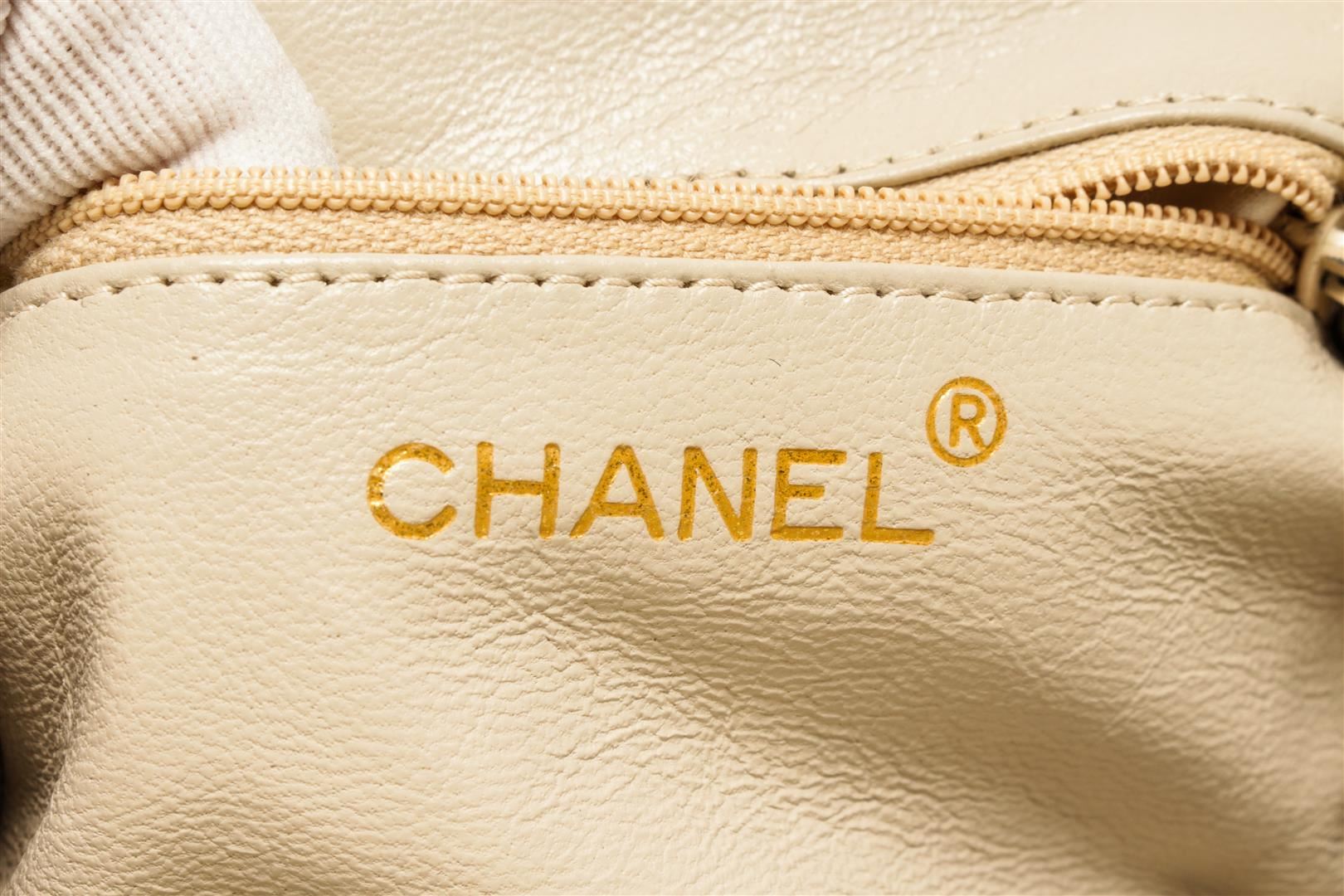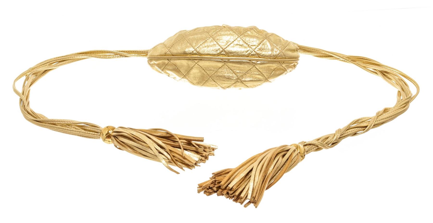 Chanel Tassel Frame Waist Bag Gold Lambskin. Brand: Chanel, Style: Tassel Frame, Type: Waist Bag, Exterior Color: Gold, Exterior Material: Lambskin, Exterior Pockets: None, Interior Color: Beige, Interior Material: Lambskin, Interior Pockets: One Zip, Closure: SN/Ap, Handle/Strap Type: Tassel, Length: 8, Width: 3, Height: 5, Strap Drop: 24. Condition: Leather is worn. Item is sold AS-IS and all information pertaining to this lot is available in the photos or this description.