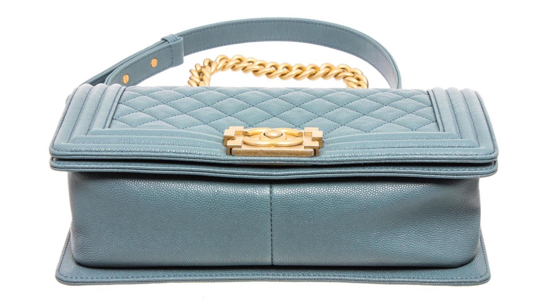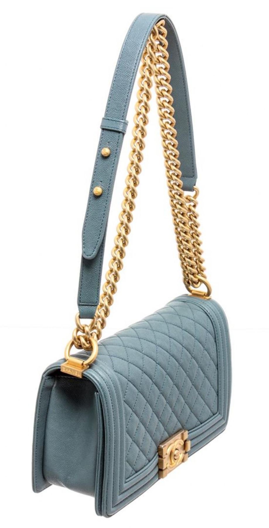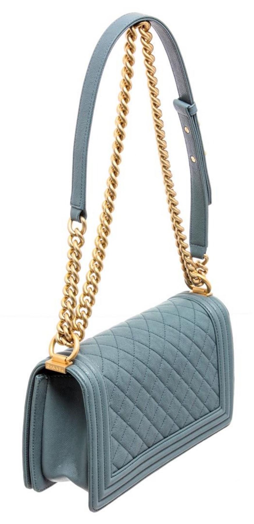 Chanel Turquoise Blue Caviar Leather Boy Bag with gold-tone hardware, convertible chain-link shoulder strap featuring leather shoulder guard, single slip pocket at interior and CC push-lock closure at front flap.