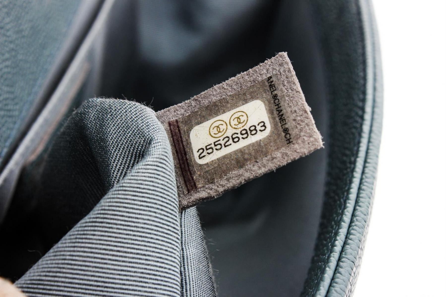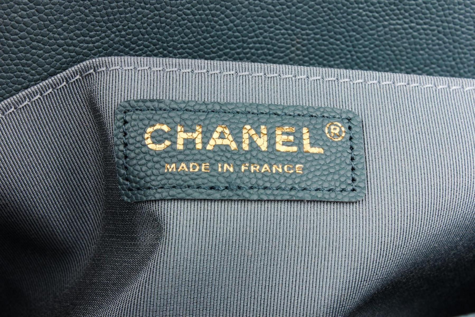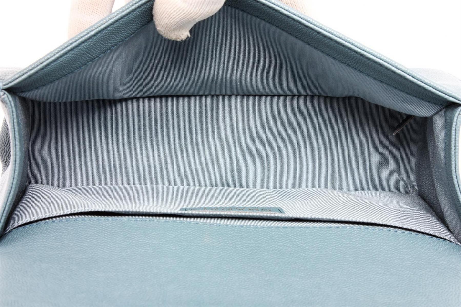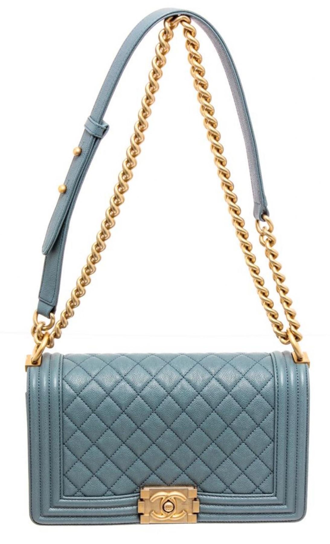 Chanel Turquoise Blue Caviar Leather Boy Bag with gold-tone hardware, convertible chain-link shoulder strap featuring leather shoulder guard, single slip pocket at interior and CC push-lock closure at front flap.