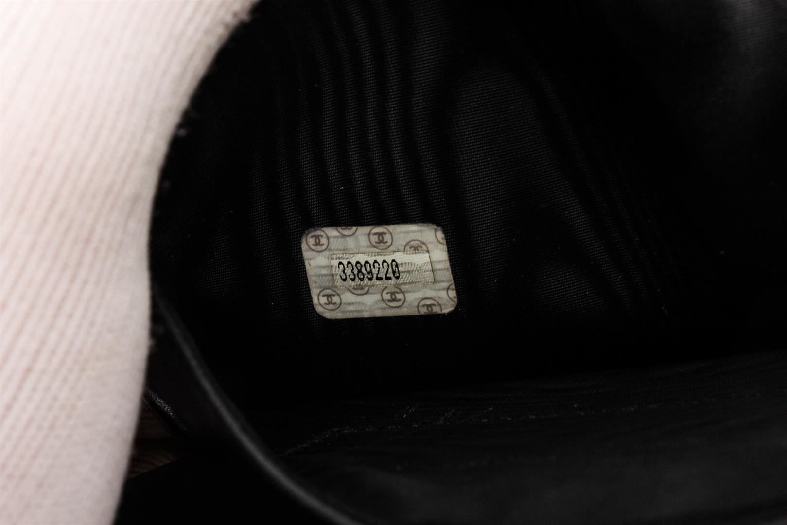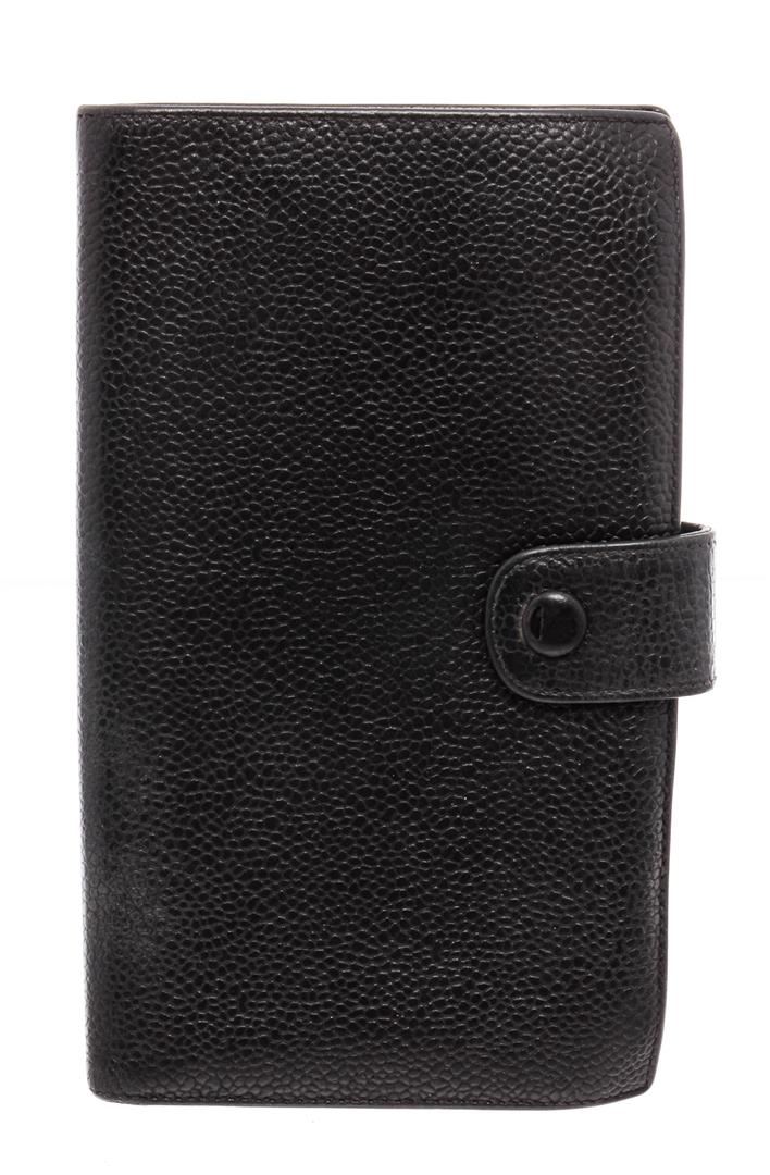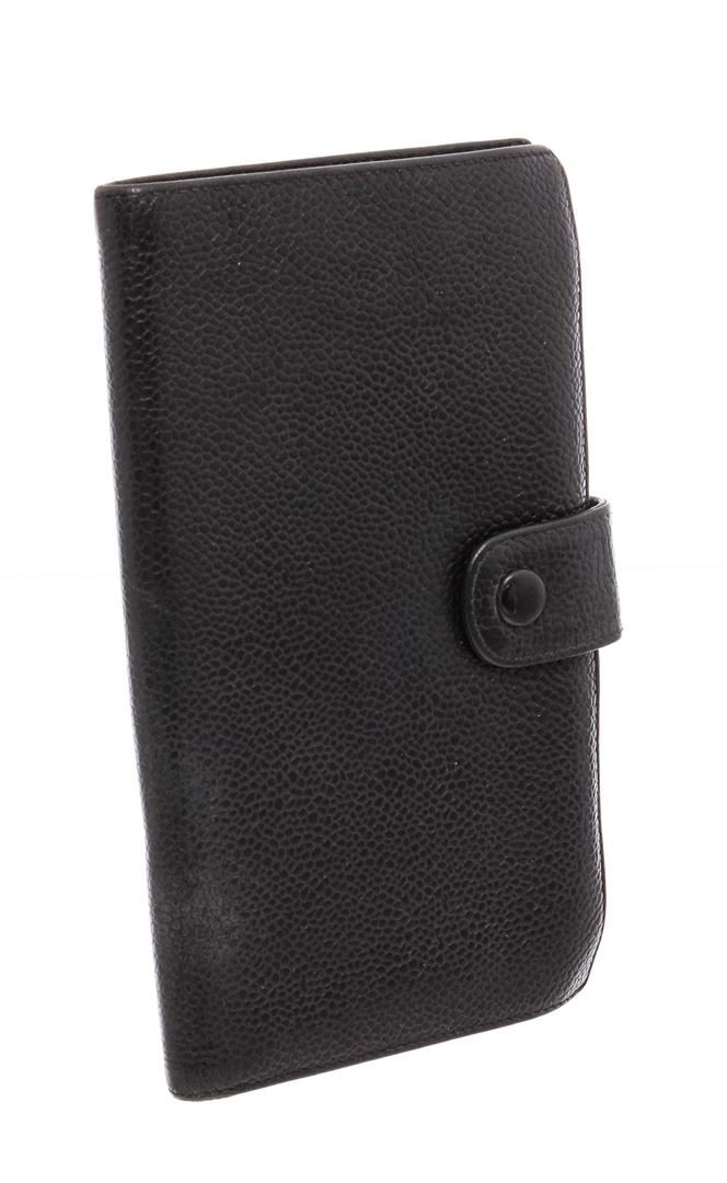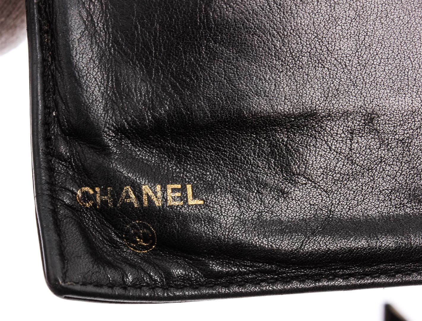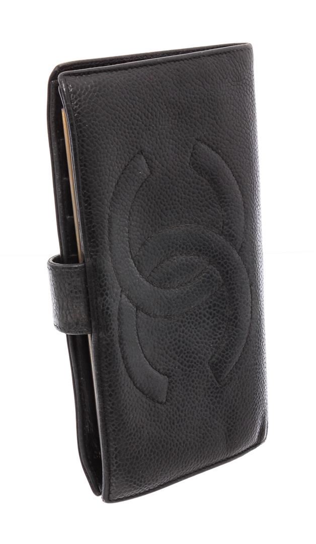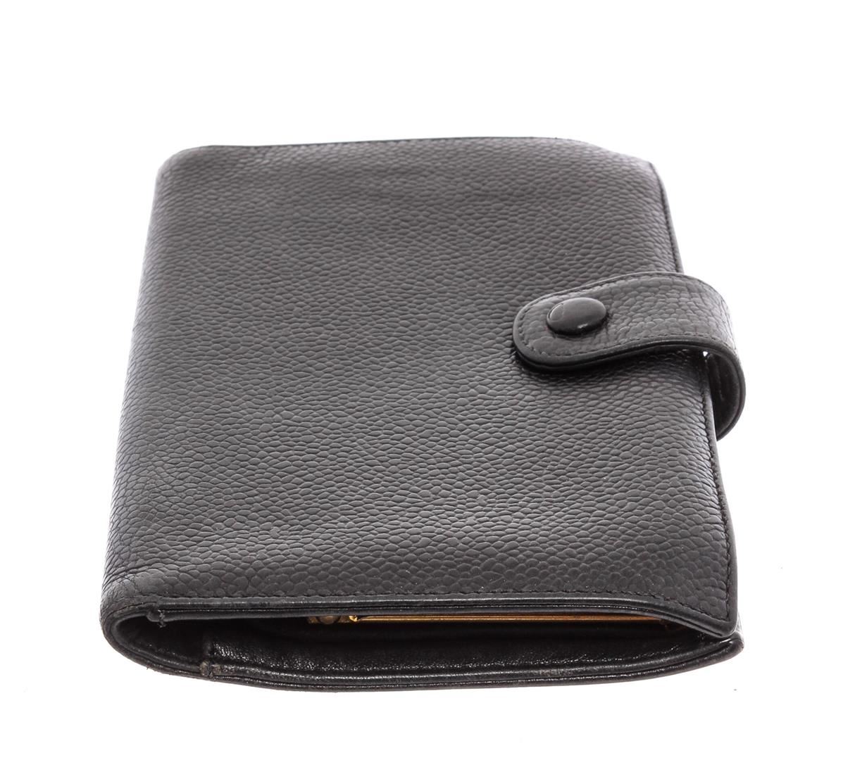 Black caviar leather vintage Chanel Timeless French Purse wallet with gold-tone hardware, stitched CC logo at front, tonal calfskin and black lining, 6 interior card slots, dual interior bill compartments, single interior push-lock coin compartment and snap closure at front.