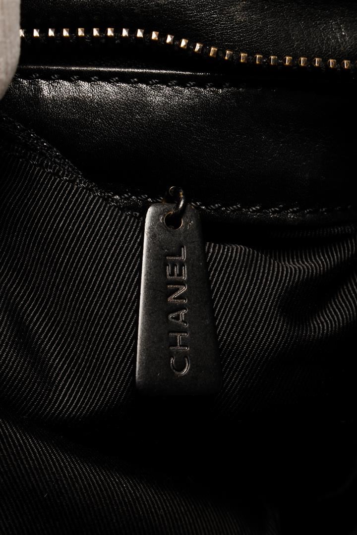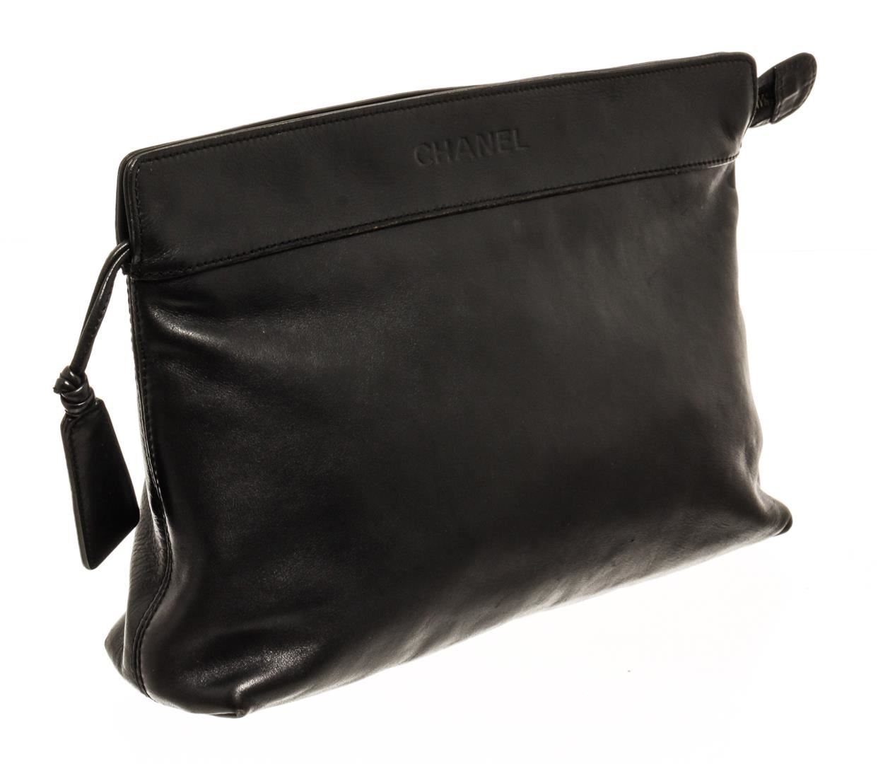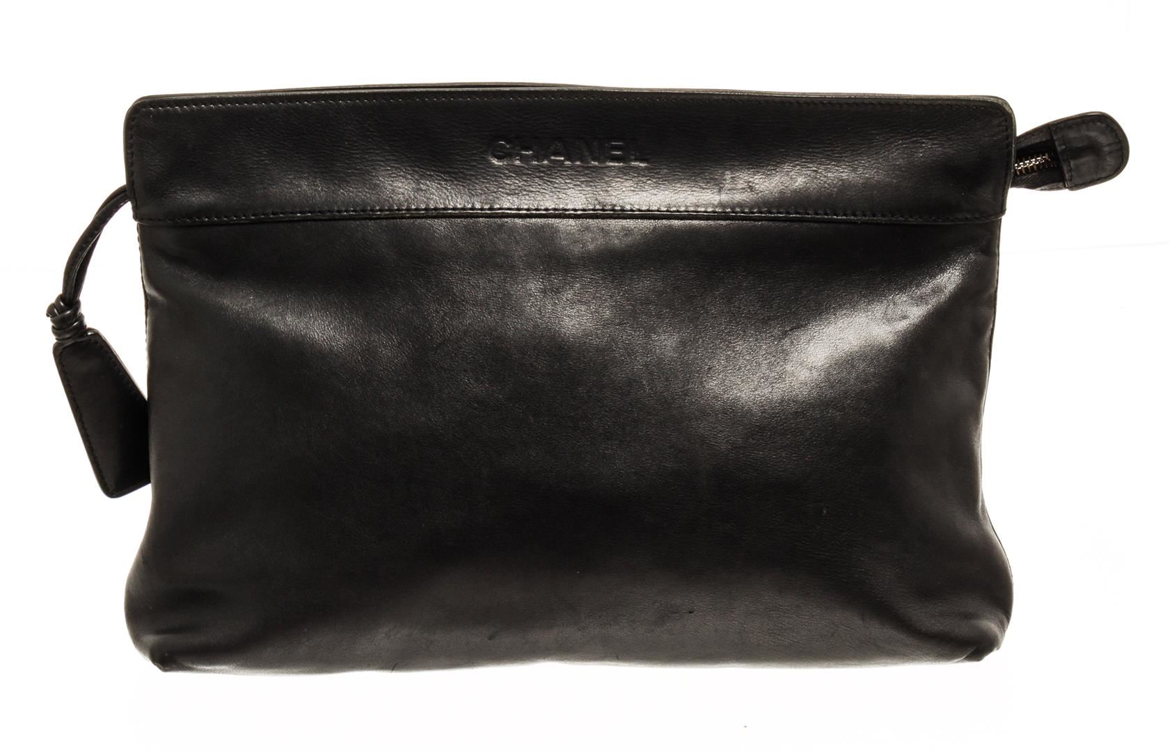 One Chanel Vintage Black Lambskin Medium Logo Zip Clutch. Item is sold AS-IS. All available information is listed in the description and shown in the photo. Chanel vintage black lambskin medium logo zip clutch with lambskin exterior, black fabric lining, silver-tone hardware, and zipper closure. Condition: odor in interior, heavy wear, creasing and scuffs on exterior, peeling and splitting on the opening corner, glue stains along opening edges, wear and stains in interior, scratches, discoloration, and tarnish on hardware.