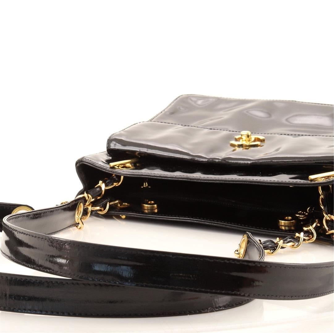 Chanel Vintage Tote Bag features black patent leather body, gold-tone hardware, front pocket with interlocking CC closure, flat back pocket with an embossed interlocking CC logo, two interwoven chain and leather shoulder straps and canvas interior lining.