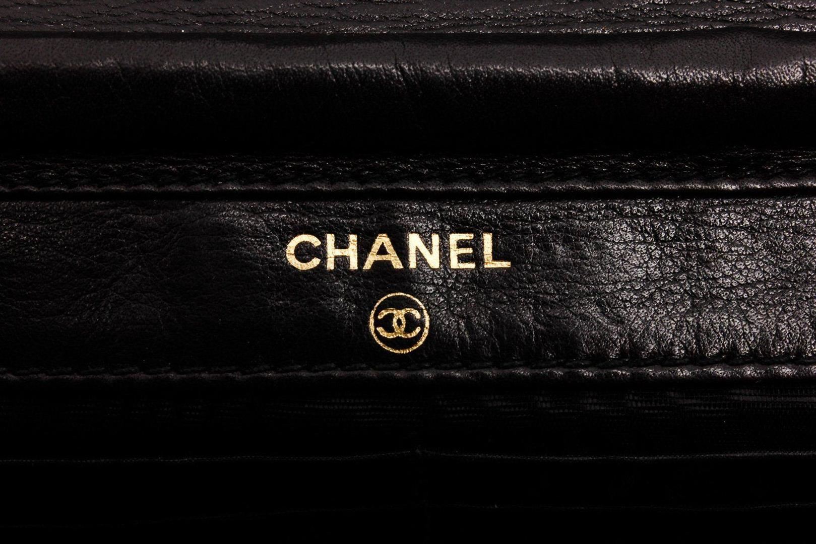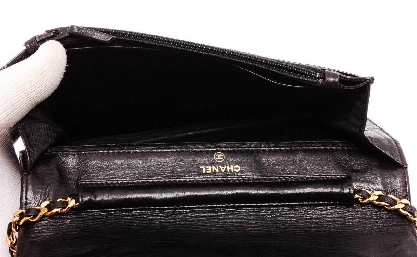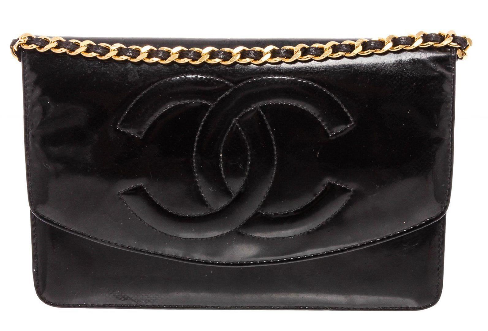 Black patent leather vintage Chanel Timeless Wallet On Chain with gold-tone hardware, single chain-link and leather shoulder strap, embossed CC logo at front, single exterior zip pocket at back, zip pocket at flap underside, single slit pocket under flap, tonal woven lining, dual interior pockets; one with zip closure, six card slots and magnetic snap closure at front flap. Measurements: Length: 7.5 in / 19 cm Width: 1.5 in / 4 cm 5 in / 13 cm Condition: Pre-Owned Good Condition overall. Please refer to photographs.