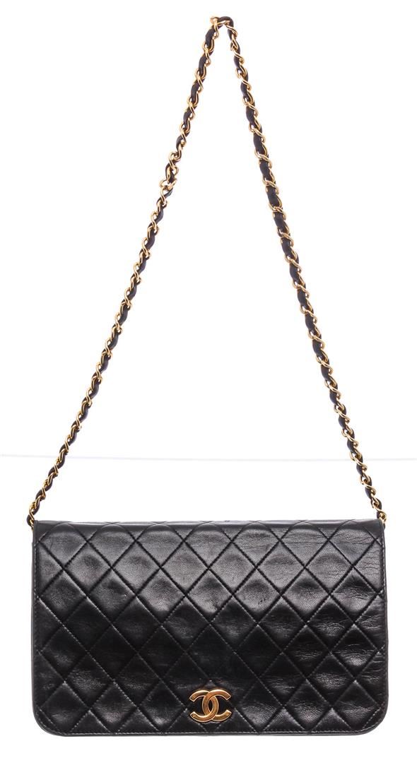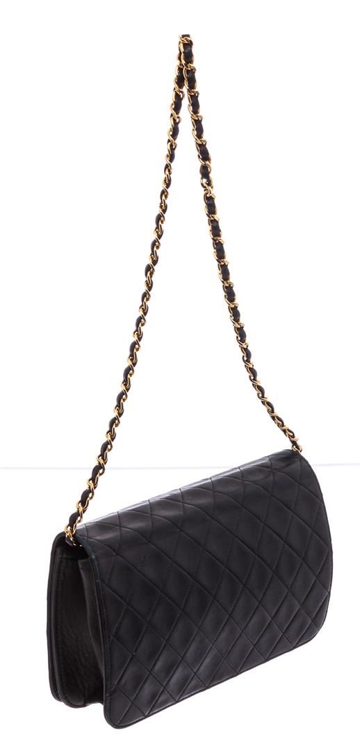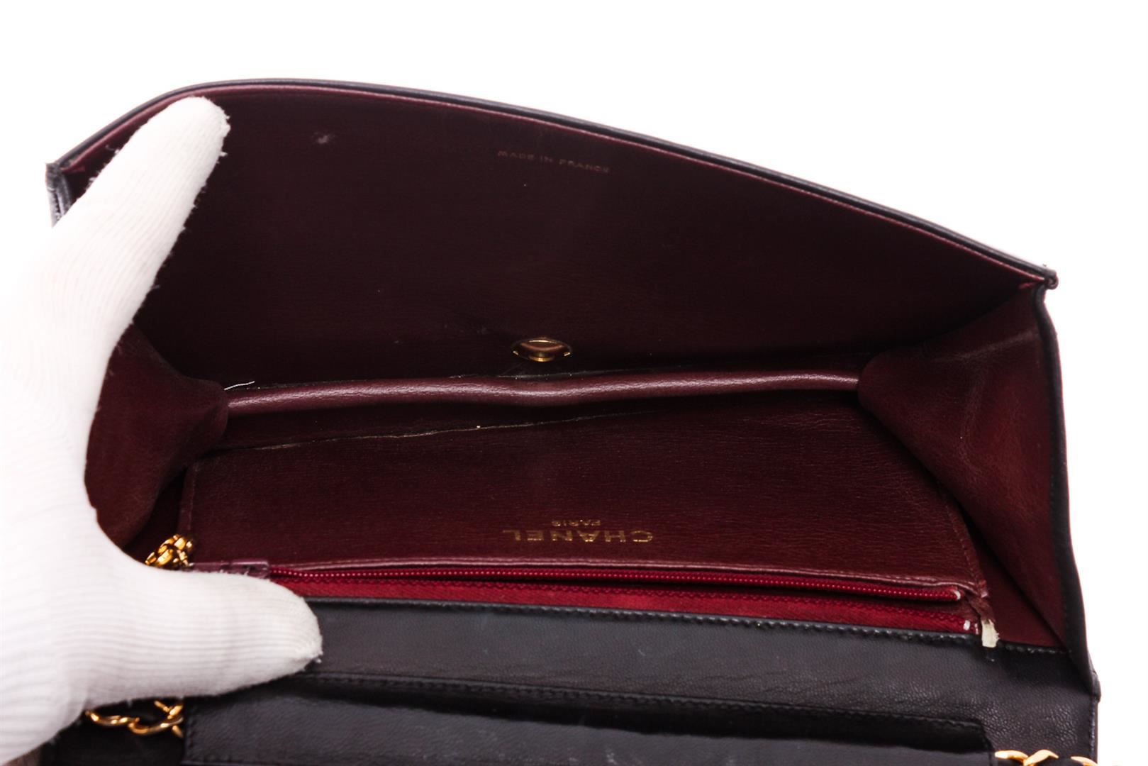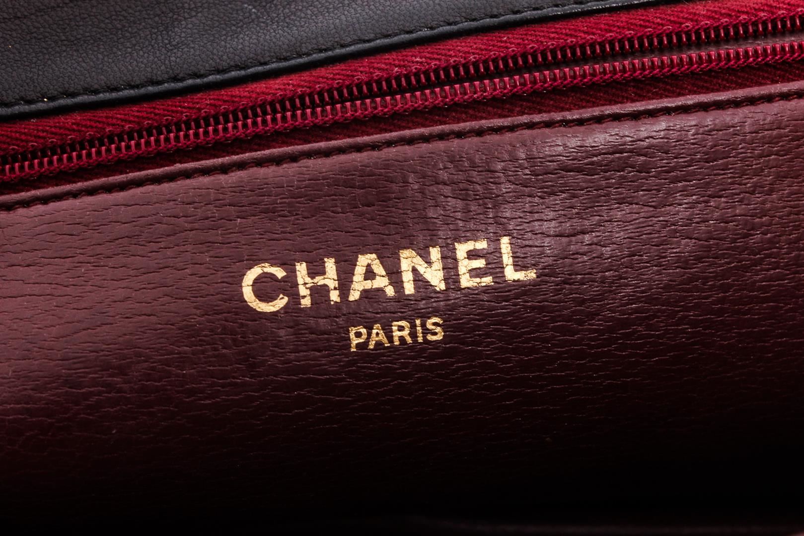 Black diamond quilted vintage Chanel flap bag with gold-tone hardware, single chain-link and leather shoulder strap, burgundy leather lining, single pocket at interior with zip closure and CC snap closure at front flap.