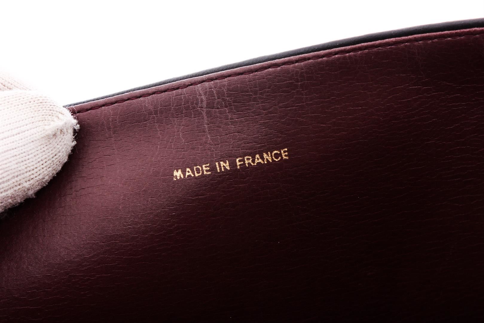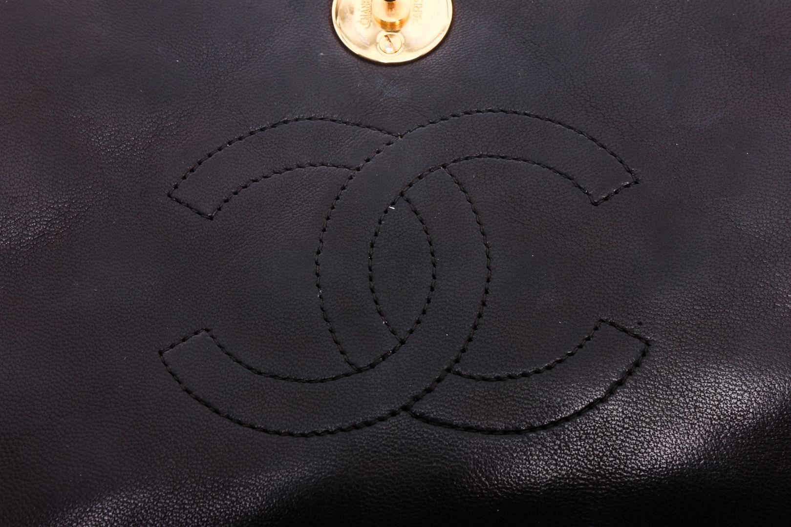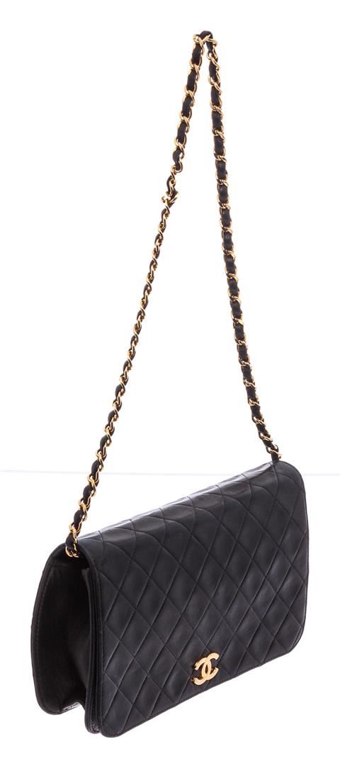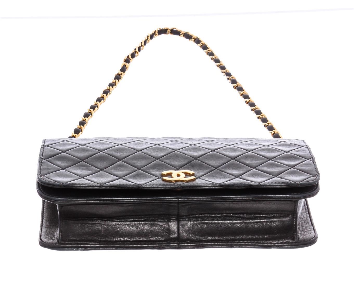 Black diamond quilted vintage Chanel flap bag with gold-tone hardware, single chain-link and leather shoulder strap, burgundy leather lining, single pocket at interior with zip closure and CC snap closure at front flap.