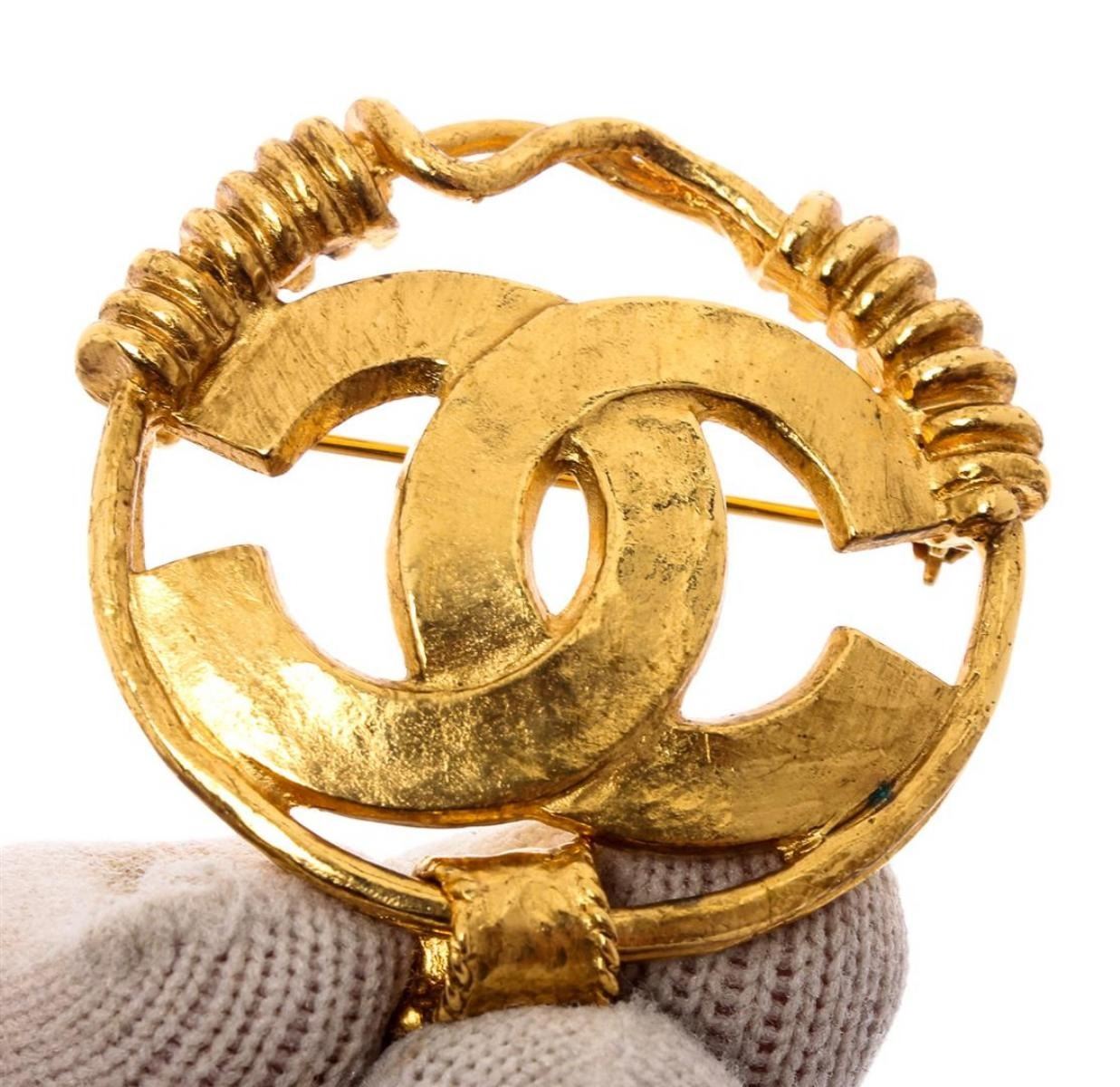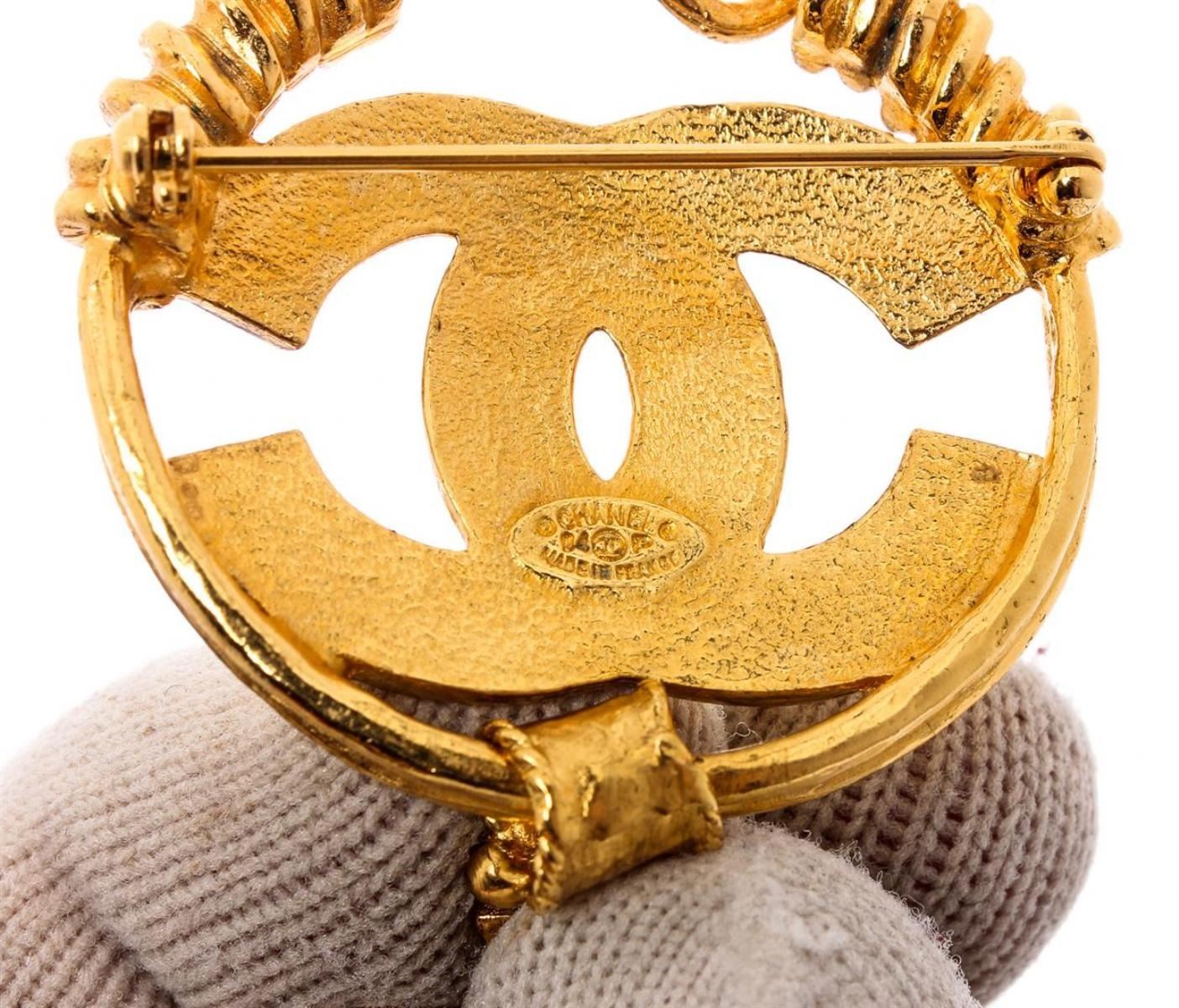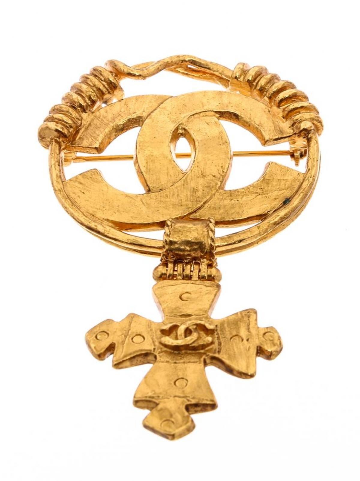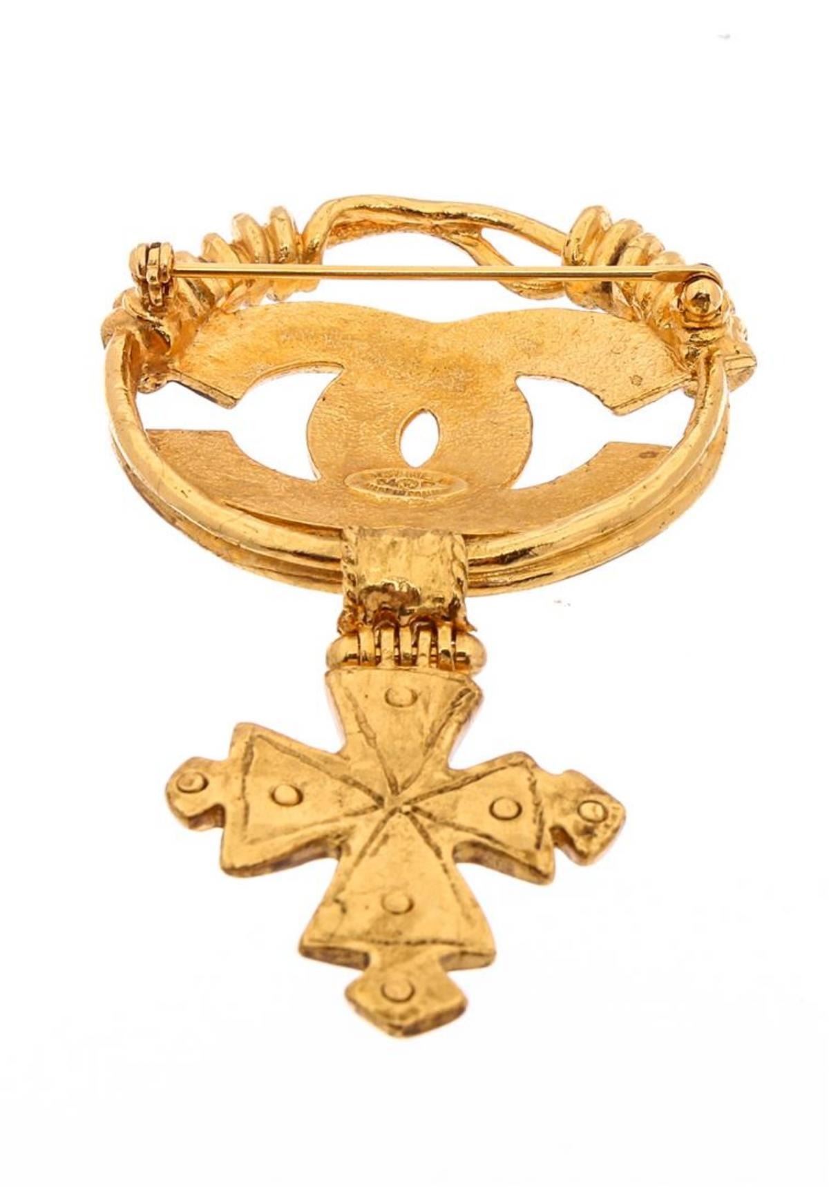 Chanel Vintage Dangling Maltese Cross Brooch from Chanel's 04P Collection, crafted in France of gold-plated metal. The hoop encircles Chanel's iconic, entwined, large CC logo. Dangling from the hoop is Chanel's Maltese cross symbol. It secures via a pin back closure.