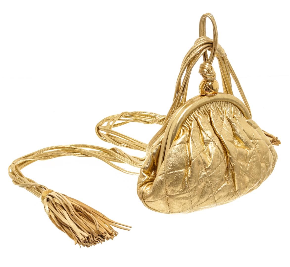 One Chanel Vintage Gold Leather Tassel Frame Waist Bag. Item is sold AS-IS. All available information is listed in the description and shown in the photo. Chanel vintage gold leather tassel frame waist bag with quilted gold leather exterior, tassel strands, kiss clasp closure, gold-tone hardware, beige leather lining, and one interior zip pocket. Height 5", Width 8", Depth 3", Strap Drop 24 / 12.7 x 20.3 x 7.62 Cm